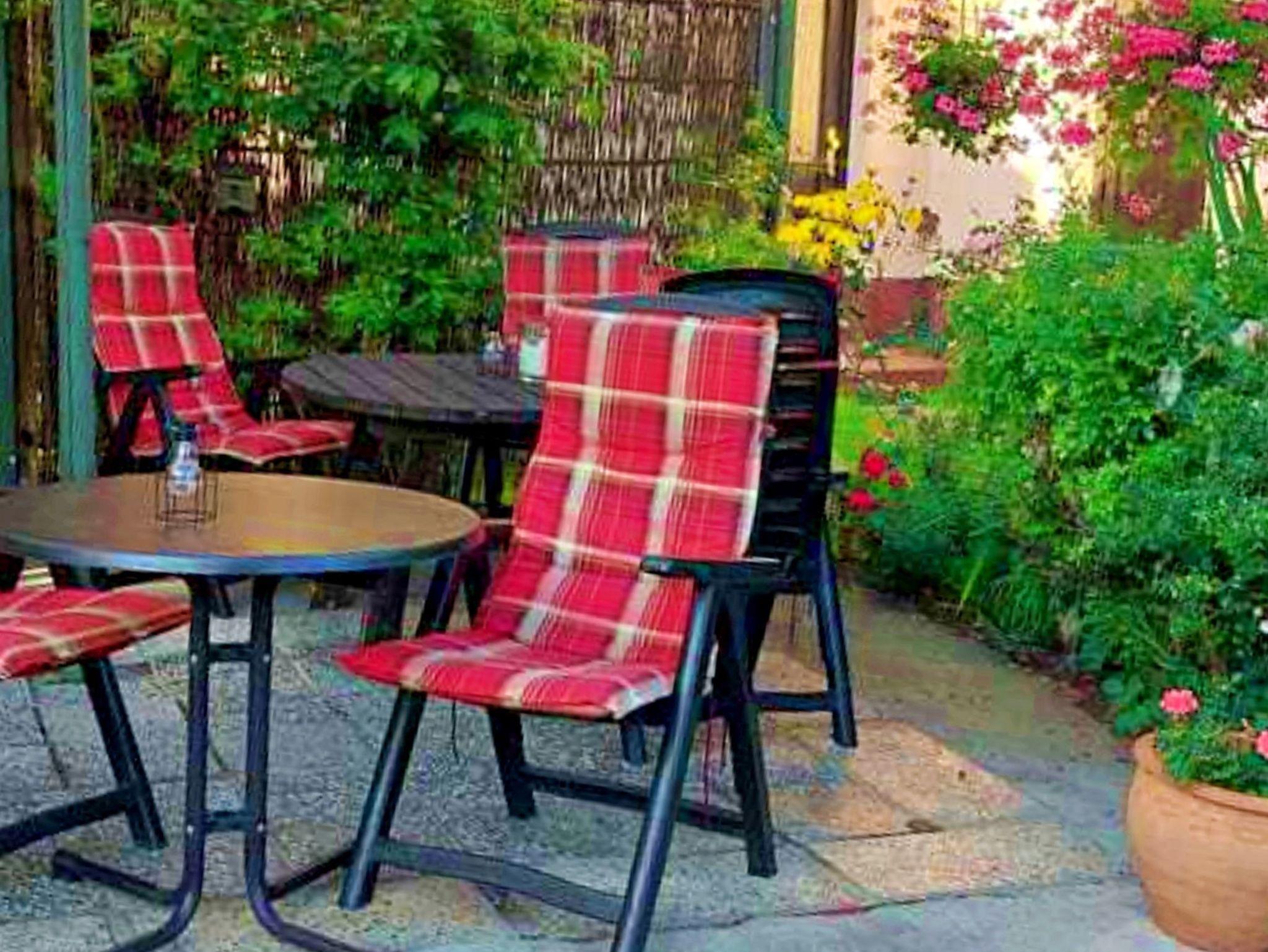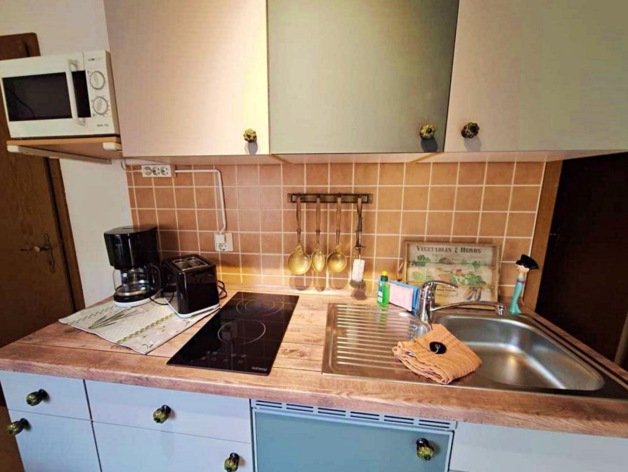 Unseren Gästen steht hier eine Ferienwohnung in herrlich grüner Lage zur Verfügung. Die Ferienwohnung ist ca. 30 qm groß und ist hell und freundlich eingerichtet und wurde im April 2024 neu renoviert. Die Ferienwohnung verfügt über ein separates Schlafzimmer (ohne Fenster) mit Einzelbett. Es gibt einen weiteren Raum mit Doppelbett und Fernseher, sodass die Ferienwohnung optimal für 3 Personen geeignet ist. Die separate Küche mit Essplatz und Fernseher dient als Aufenthaltsraum. Ein Wohnzimmer gibt es nicht. In der Küche gibt es einen 2-Platten-Ceranherd, Kühlschrank, Mikrowelle, Kaffeemaschine und Toaster. Unsere Gäste genießen den direkten Blick ins Grüne. Für ein gemütliches Frühstück oder Abendessen an herrlich, lauen Sommertagen steht eine überdachte Terrasse sowie eine Sitzfläche im Freien zur Verfügung. Grillmöglichkeiten sind selbstverständlich vorhanden.Die Erstausstattung Bettwäsche ist inklusive. Handtücher bringen Sie bitte selbst mit.
