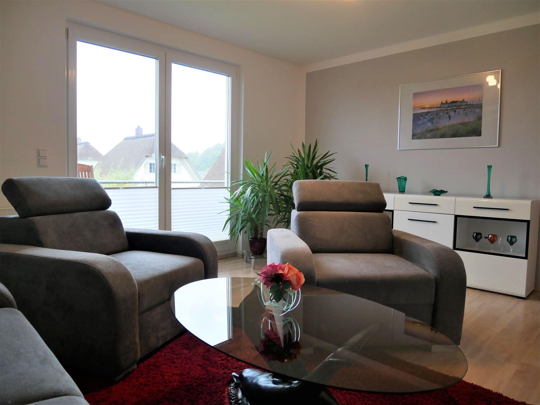 Sie teilt sich auf in ein lichtdurchflutetes Wohnzimmer, ein Schlafzimmer mit Doppelbett und in ein hochwertiges Badezimmer mit Dusche und Badewanne. Vom Balkon aus haben Sie einen herrlichen Ausblick. Die Erstausstattung Bettwäsche und Handtücher ist bereits im Gesamtpreis enthalten.