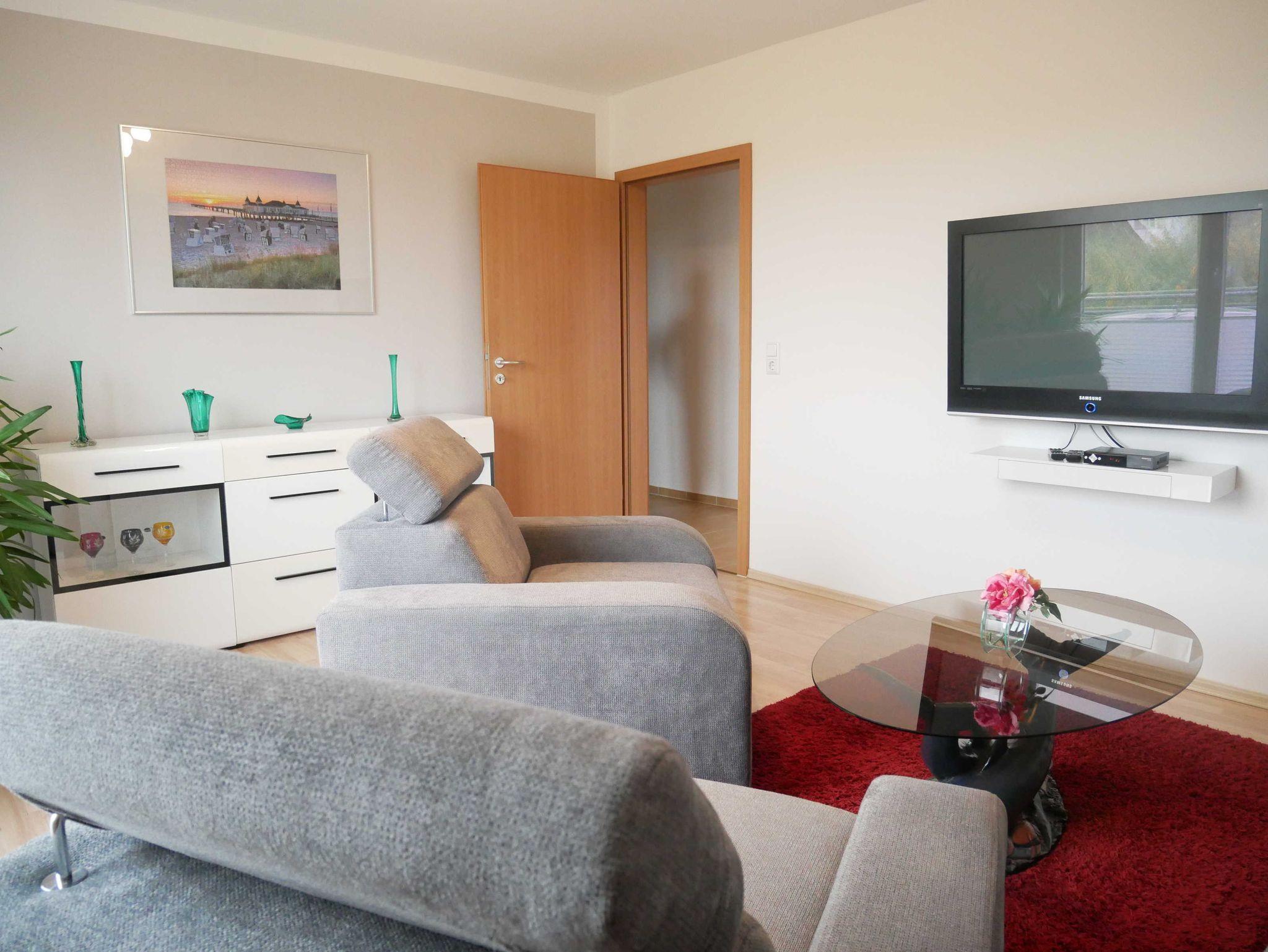 Die moderne 69qm große 2-Raum-Ferienwohnung liegt im 1. OG und verfügt über ein lichtdurchflutetes Wohnzimmer mit gemütlicher Couchecke und Flat-TV, sowie ein Schlafzimmer mit Doppelbett, einem weiteren TV und einem großen Kleiderschrank für Ihre Urlaubsgarderobe. Die separate Küche mit Esstisch ist mit Backofen, Cerankochfeld, Kühlschrank, Mikrowelle, Kaffeemaschine, Wasserkocher und Toaster ausgestattet. Das hochwertige Badezimmer verfügt über Dusche und Badewanne, sowie über einen Haartrockner. Vom Wohnzimmer aus gelangen Sie auf den großen Balkon mit Sitzmöbeln und Blick ins Grüne. Die Erstausstattung Bettwäsche und Handtücher, sowie W-LAN sind bereits inklusive. Ein Parkplatz steht Ihnen ebenfalls kostenfrei zur Verfügung.