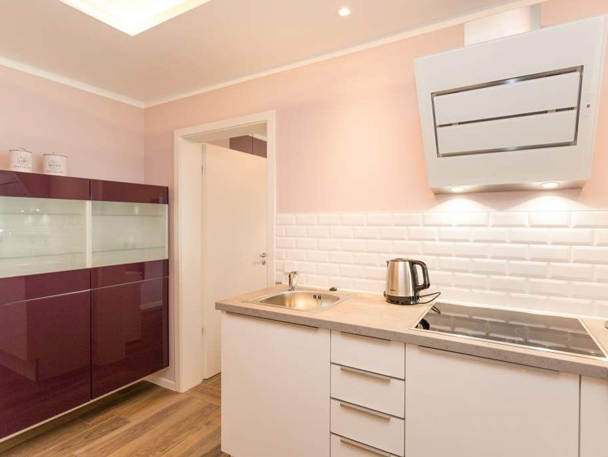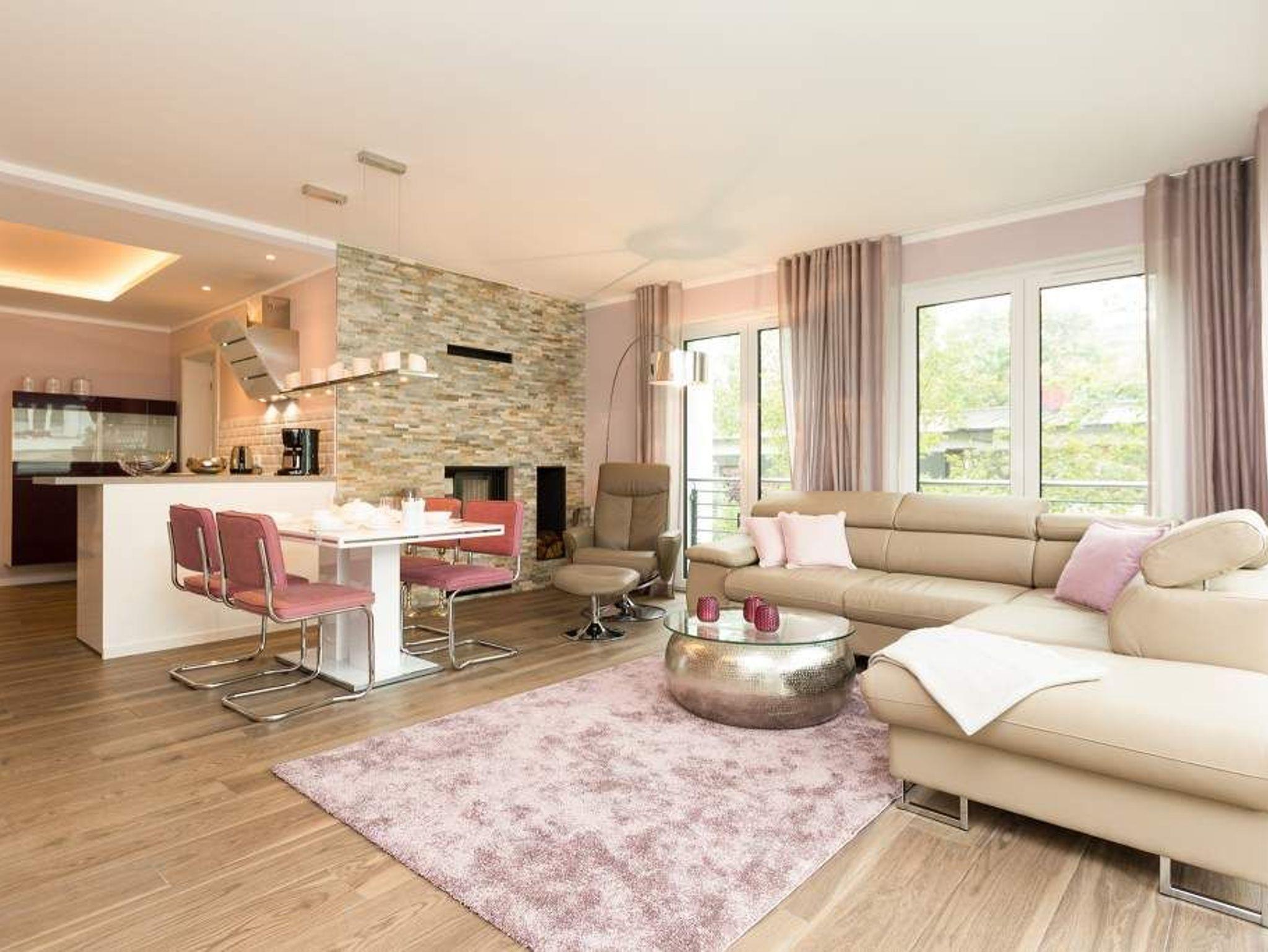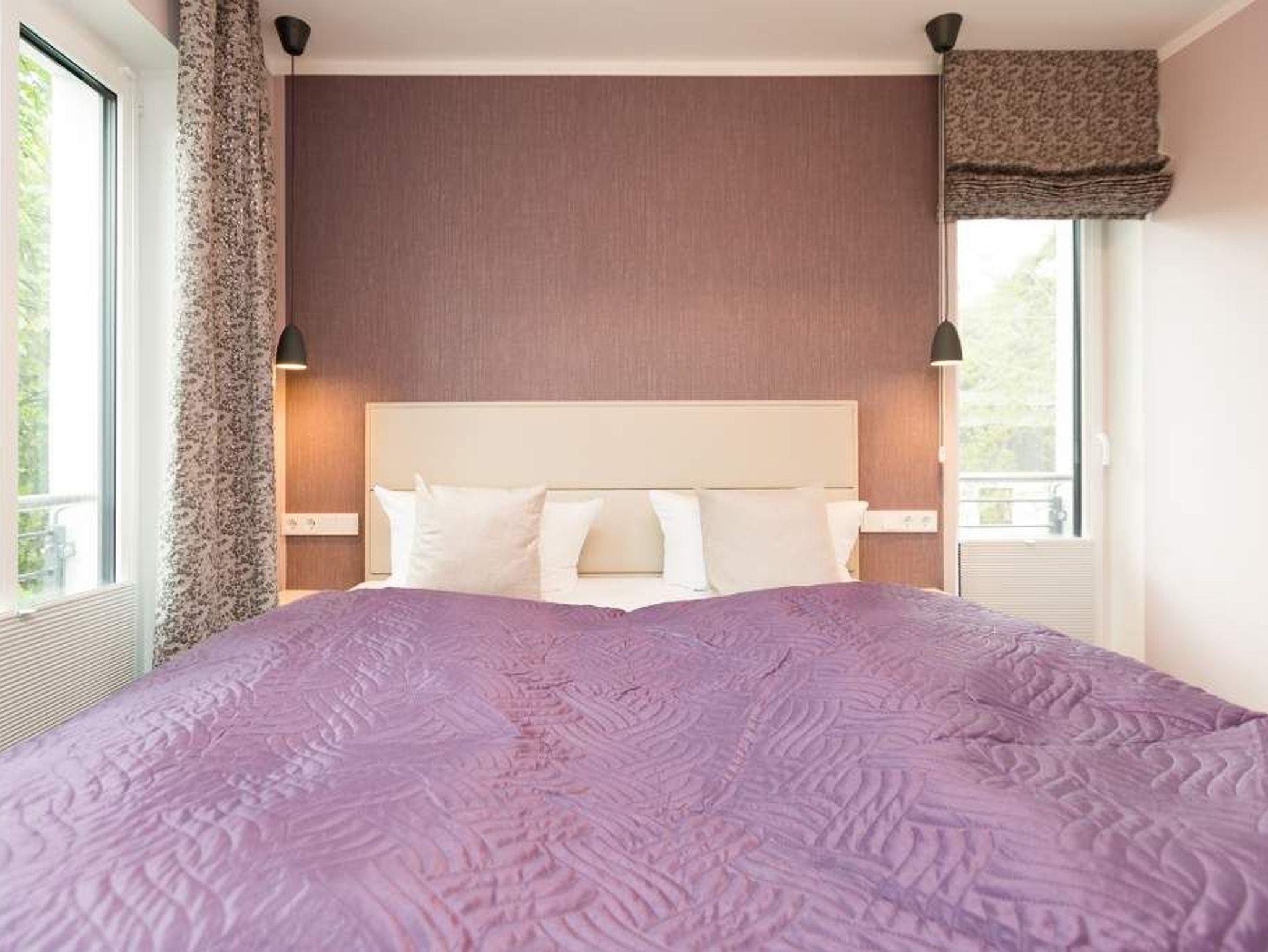 Der perfekte Urlaub beginnt mit dem perfekten Aufwachen in einer Wohnung, in der man sich rundum wohlfühlt. Eingekuschelt in die weißen Laken, noch einmal räkeln und ausstrecken in den herrlich bequemen Doppelboxspringbetten (1,80 m x 2,00 m) der beiden wunderbar lichtdurchfluteten Schlafzimmer ? schöner kann der Start in den Urlaubstag nicht sein. Die 87 Quadratmeter große Wohlfühlwelt der Wohnung Nummer 9 im zweiten Obergeschoss der Villa Strandgrün bietet in ihren drei Räumen Platz für vier Personen und ein Kleinkind im Kinderreisebett. Großzügig, hell und in zarten Rosé- und Violett-Tönen gehalten, strahlt das Appartement Eleganz und Leichtigkeit aus. Ob auf der komfortablen Sofalandschaft, dem gemütlichen Lesesessel oder am stylischen Designer-Esstisch ? hier kann man es sich gut gehen lassen. Ein absolut außergewöhnliches Highlight ist der Kaminofen, dessen romantisches Flackern sowohl vom Wohnzimmer als auch von einem der beiden Schlafzimmer aus genossen werden kann. Flat-TVs gibt es in jedem der drei Zimmer. Vom Wohnzimmer aus geht es auf den großen Südbalkon mit Gartenmöbeln, Sonnenliege und Blick auf den begrünten Garten und die umliegenden Bädervillen. Die offene Küche mit Metrofliesen ist mit hochwertigen Geräten und Design-Geschirr ausgestattet. Jedes Schlafzimmer verfügt über Einbauschränke und ein eigenes Bad mit Dusche, Waschtisch und WC. Natürlich können die Schlafzimmer verdunkelt werden. Eine geräumige Panorama-Sauna auf dem Flur lädt zum wohligen Abschalten an kühlen Tagen und Abenden ein. Ein kleiner Hauswirtschaftsraum bietet Stauraum. Damit Sie sich so richtig entspannen können, sind die Betten bezogen und Handtücher liegen für Sie bereit. In der Tiefgarage ist ein Stellplatz reserviert. Im wohnungseigenen Kellerraum ist Platz für maximal 2 Fahrräder.