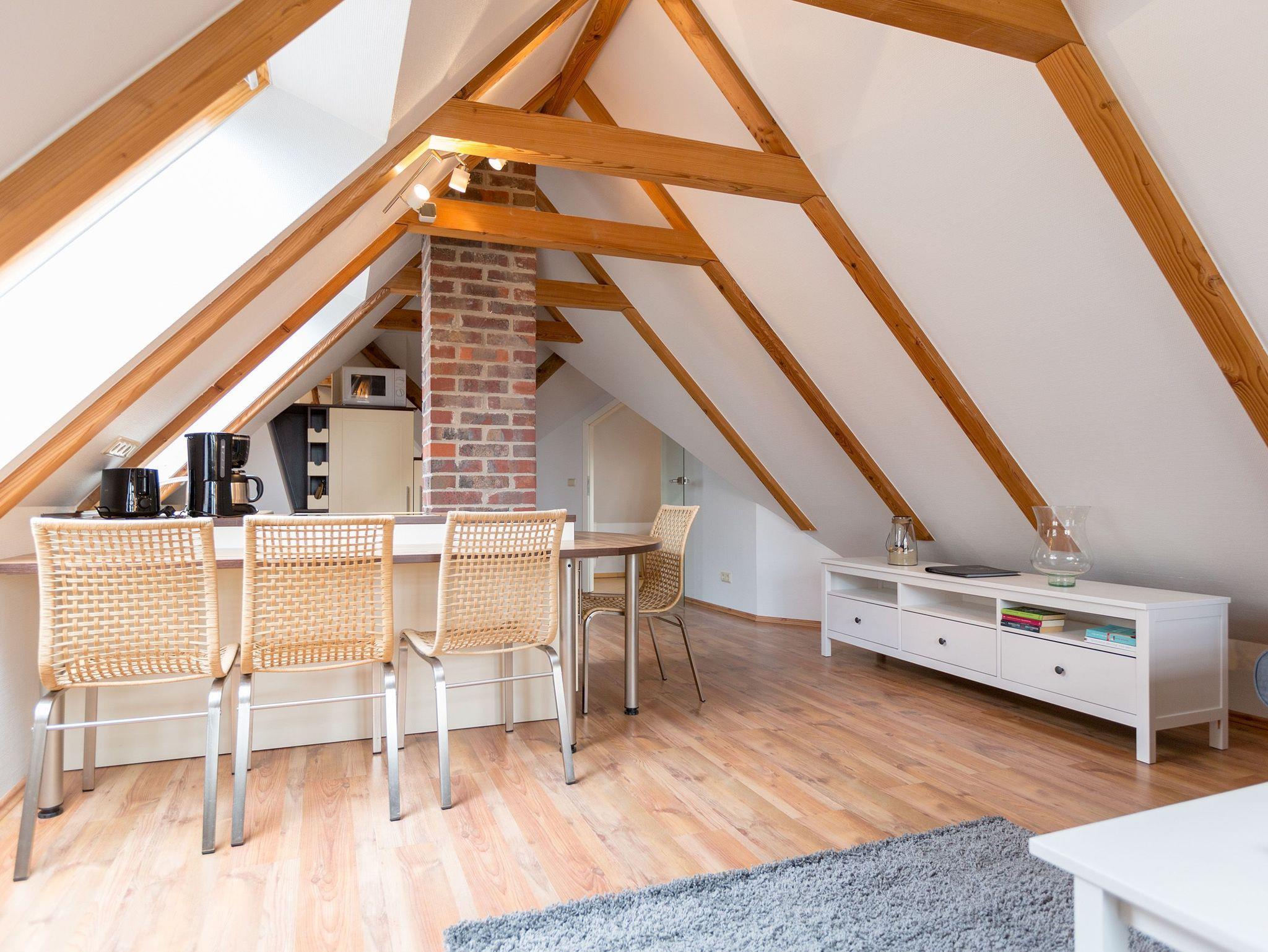 Klein, aber fein und ganz gemütlich unter dem Dach - die helle, freundliche Ferienwohnung im Dachgeschoss der Villa ist 45 qm groß. Baulich bedingt müssen größer gewachsene Gäste im Flurbereich ihren Kopf kurz einziehen weil die ursprüngliche Balkenlage im Dachgeschoss erhalten wurde. Modern, komfortabel und geschmackvoll eingerichtet, bietet es zwei Personen und einem Kleinkind (bis 3 Jahre) Platz zum Wohlfühlen. Das Appartement verfügt über ein Wohnzimmer mit Küchenzeile, ein Schlafzimmer mit Doppelbett und ein Bad mit Dusche und WC. Auf Wunsch stellen wir für unsere kleinen Gäste ein Kinderreisebett (ohne zusätzliche Matratze [&] Bettzeug) und einen Kinderhochstuhl (gegen einen Aufpreis) zur Verfügung.