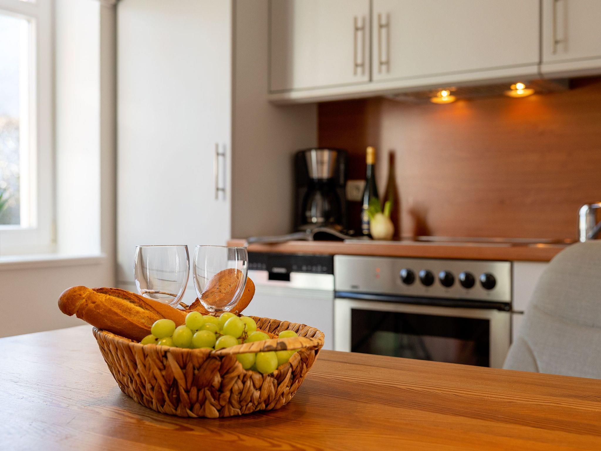 Unser Appartement 4 wurde im Winter 2024 - 25 in Teilen renoviert. Als ehemalige Einliegerwohnung mit separatem Eingang, den Sie über die Außentreppe neben der Garage erreichen, bietet das Appartement auf ca. 71 qm alles, was es für einen erholsamen Aufenthalt mit bis zu 4 Personen benötigt. Die integrierte Küchenzeile ist vollausgestattet mit Cerankochfeld, Kühlschrank mit Gefrierfach, Backofen, Geschirrspülmaschine, Kaffeemaschine, Wasserkocher und Toaster.