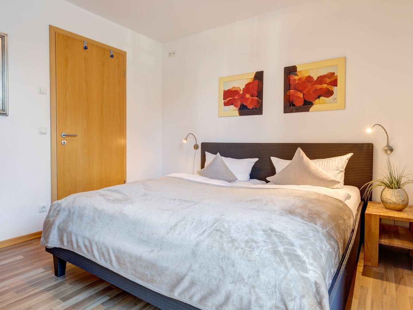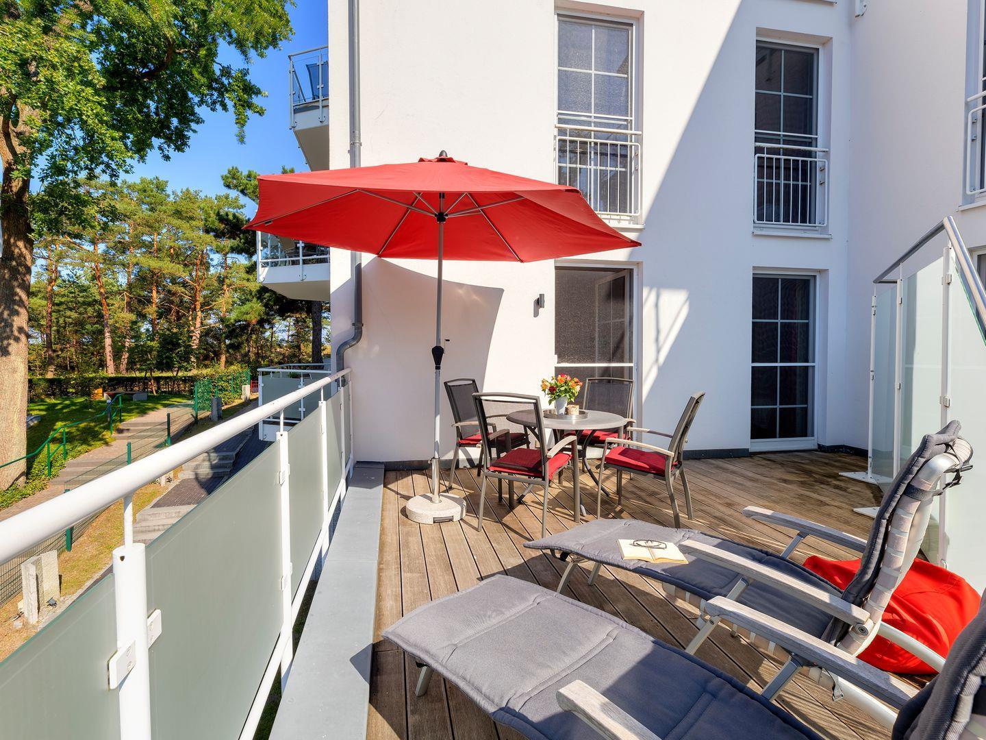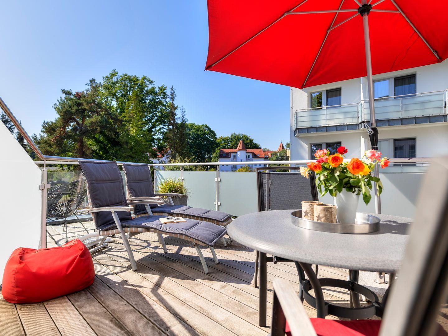Genießen Sie diese mit 5-DTV-Sternen zertifizierte, moderne und individuell eingerichtete 3-Zimmer Ferienwohnung mit der über 20 qm großen Sonnendachterrasse nach Südwesten und dem Westbalkon mit Blick zur Strandpromenade. Hier können Sie herrlich entspannt frühstücken, essen oder sonnenbaden. Die im 1. Obergeschoß gelegene, komfortable Wohnung verfügt über beheizte Granitfußböden und edle Parkettfußböden in den 2 Schlafzimmern, sowie ein geräumiges Wohn -und Esszimmer und eine hochwertige, voll ausgestattete Küche.