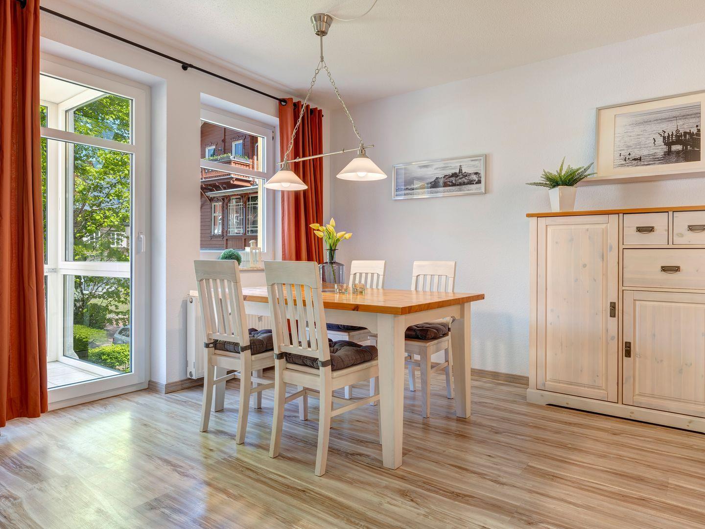 Das besondere Highlight dieser Ferienwohnung ist der gemütliche Wintergarten: Hier können Sie geschützt vor Wind und Wetter Ihr Frühstück genießen oder den Tag bei einem Glas Wein ausklingen lassen. Der Wintergarten bietet Ihnen einen herrlichen Blick auf das park ähnlich angelegte Grundstück und einen seitlichen Blick zur Strandpromenade – perfekt für entspannte Stunden unabhängig vom Wetter.