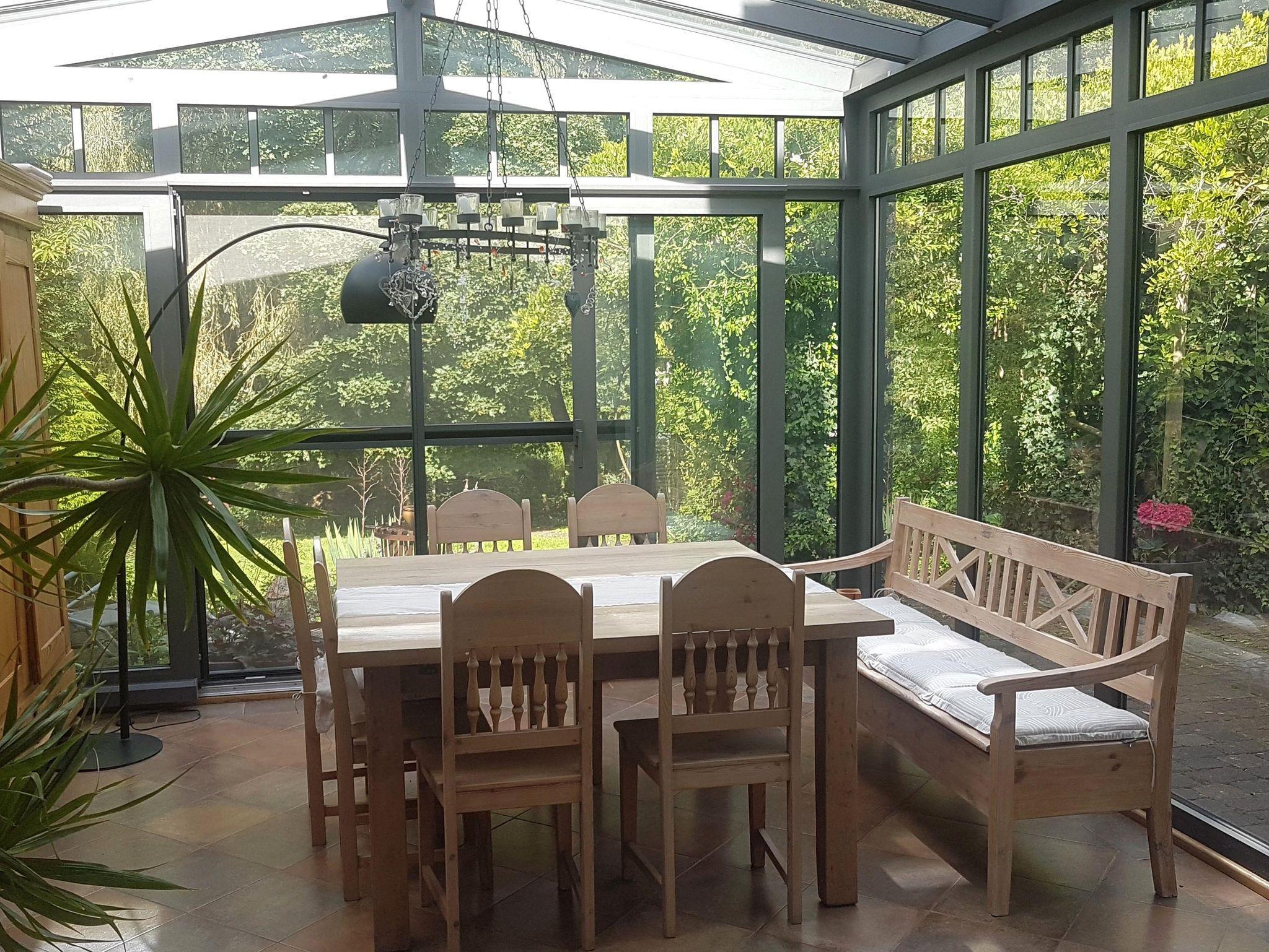 Im Inneren des Hauses erwartet Sie eine harmonische Kombination aus traditionellem Charme und Komfort. Die offene Küche bietet viel Platz zum gemeinsamen Kochen, während der kuschelige Wohnbereich mit Kaminofen zu entspannten Stunden einlädt. Der lichtdurchflutete Wintergarten mit großzügigem Essplatz und Blick ins Grüne schafft den stimmigen Rahmen für gesellige Momente .