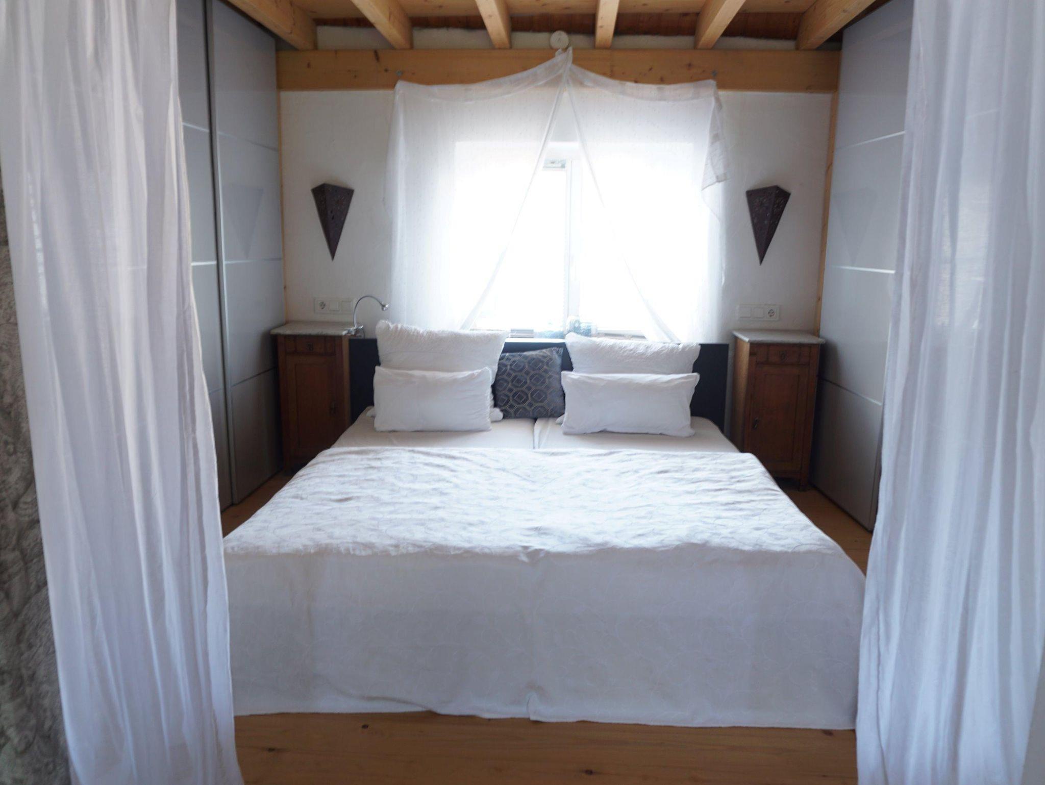 Im Obergeschoss erwartet Sie ein abdunkelbares Schlafzimmer mit Doppelbett (1,60m ), ein kleines Bad und ein großzügiger, offen gestalteter Schlafbereich (Doppelbett 2m) mit Galerie und Bettcouch (1,40m), die perfekt ist für entspannte Lesestunden oder als zusätzlichen Schlafplatz.