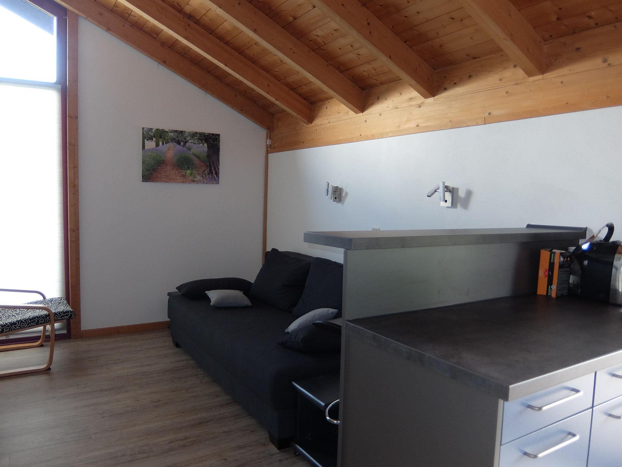 Unsere FeWo mit einer Gesamtfläche von 60 qm liegt im 1. Stock unseres Holzhauses und ist leider nur über eine Treppe, also nicht barrierefrei zu erreichen. Sie gliedert sich in Flur, Schlafzimmer, Wohnküche mit Spülmaschine, Panoramazimmer und Bad. Die Infrarot-Wärme-Kabine kann gegen Gebühr genutzt werden. Von der Wohnküche aus erreicht man einen großen Balkon, auf dem Outdoor-Möbel zur Verfügung stehen. Die FeWo ist für 2 Personen ausgelegt, allerdings kann das Sofa in der Wohnküche umgebaut und als Schlafgelegenheit für max. 2 Personen genutzt werden.