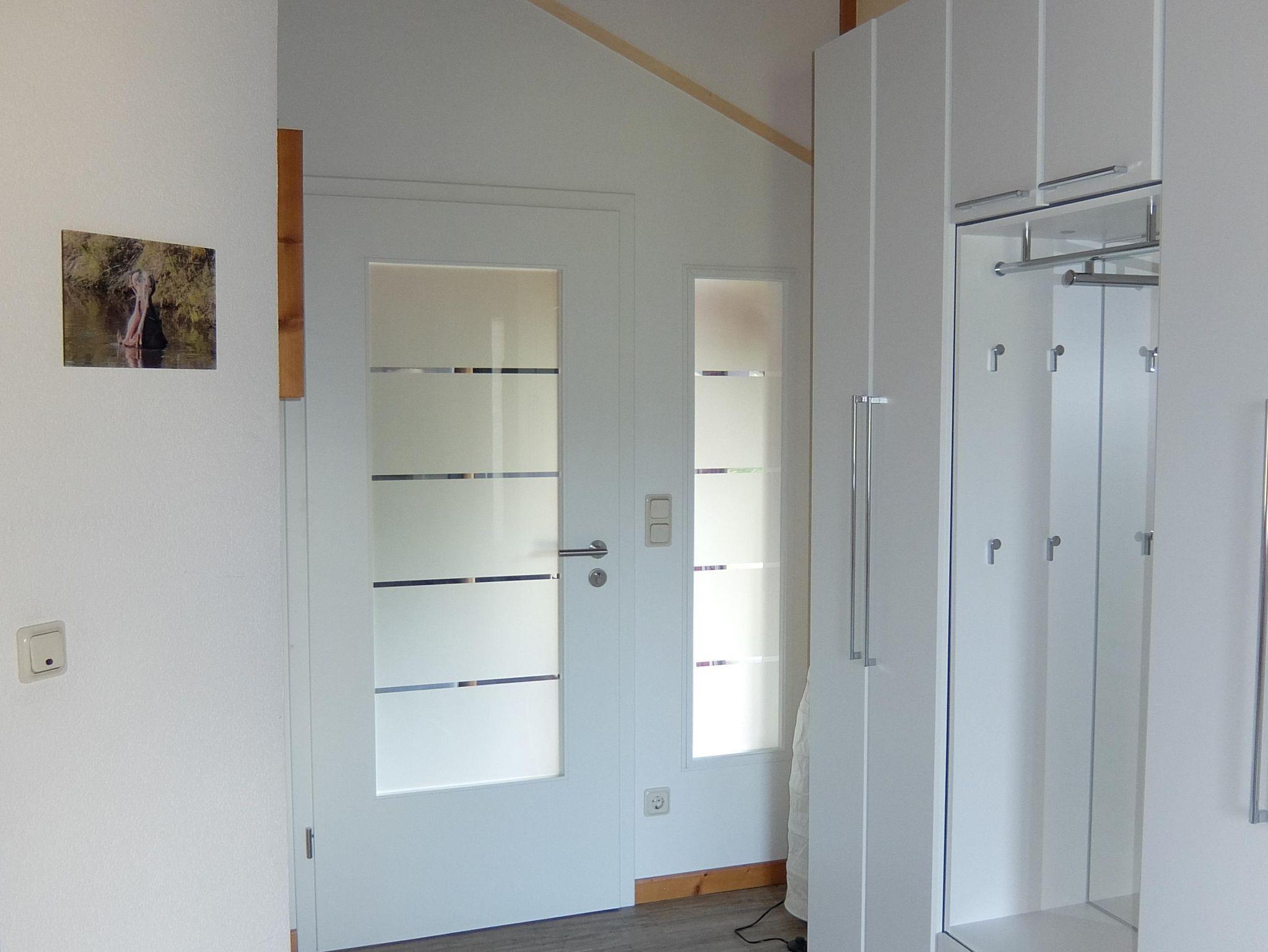 Unsere Ferienwohnung mit einer Gesamtfläche von 60 qm liegt im 1. Stock unseres Holzhauses und ist leider nur über eine Treppe, also nicht barrierefrei zu erreichen. Sie gliedert sich in Flur, Schlafzimmer, Wohnküche mit Spülmaschine, Panoramazimmer und Bad.