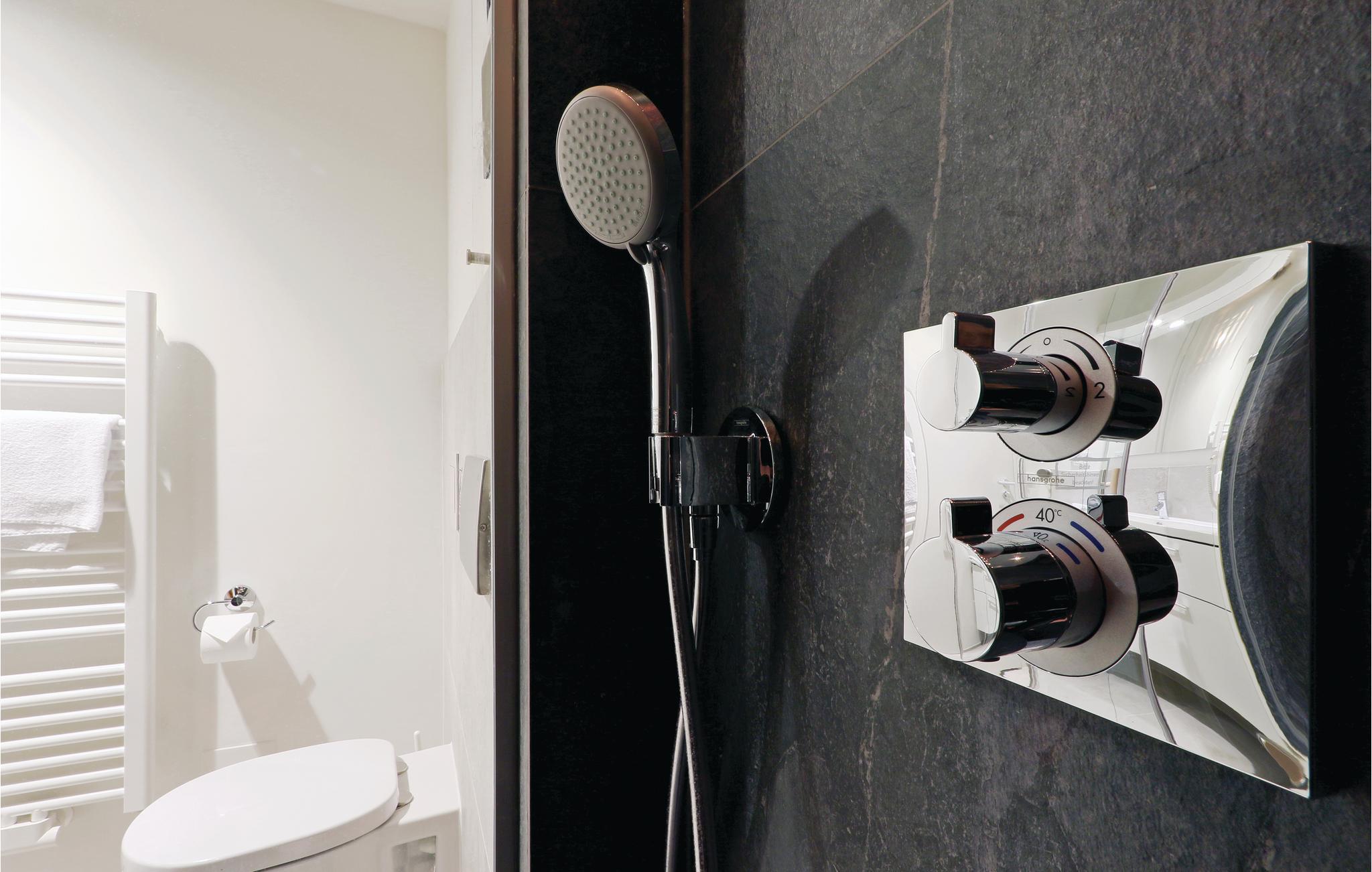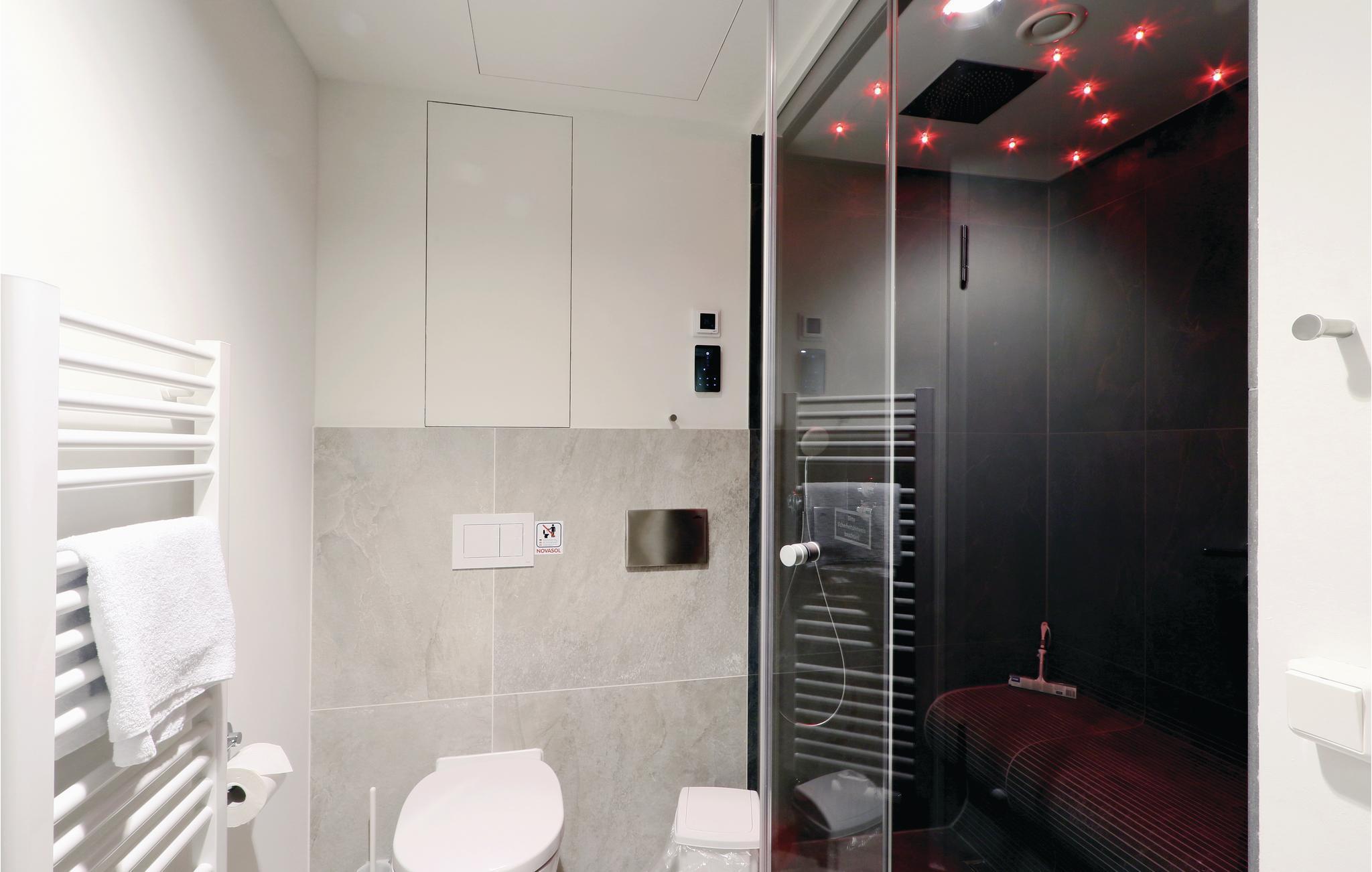 Badrummet presenterar sig som ditt personliga wellnessområde. Här kan du värma upp dig i bastun efter en lång promenad vid Östersjön. Badrummet har även ett ångbad med regndusch.