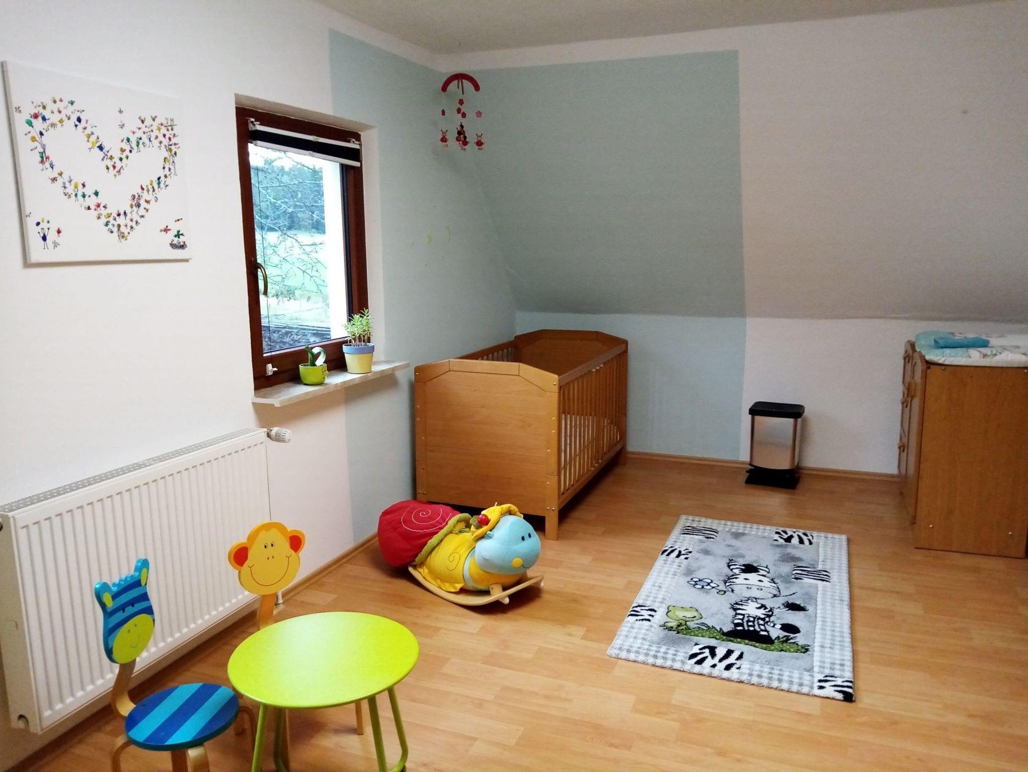 ? Kinderzimmer mit Einzelbett, Babybett, Kleiderschrank, Sofa, Wickelkommode, Kindertisch und zwei Kinderstühlen