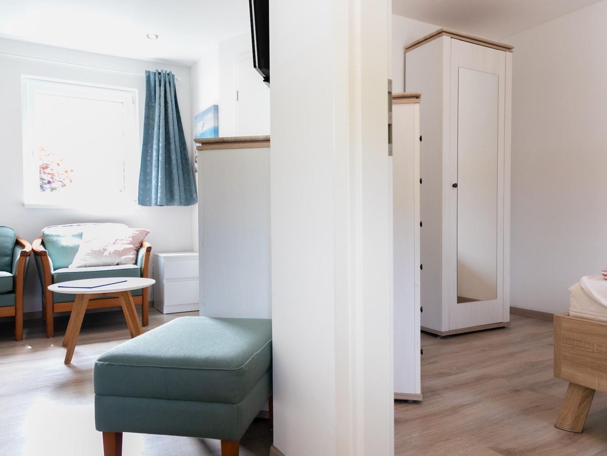 Die offene Wohnküche ist mit einem Kühlschrank, einem Herd mit Ceranfeld und einem Backofen sowie den wichtigsten Küchenutensilien ausgestattet. Ein Esstisch mit Stühlen, ein modernes Sofa, ein Couchtisch sowie ein Flachbildfernseher sorgen für Gemütlichkeit. Im Bad befindet sich eine ebenerdige Dusche, das WC und ein Waschbecken. Die überdachte Holzterrasse ist mit Stühlen und einem Tisch ausgestattet und lädt euch dazu ein, den vielen Vögeln im naheliegenden Wald zu lauschen. Der Strom wird den Gästen nach Verbrauch und Zählerstand nach Abreise in Rechnung gestellt. Das Warmwasser läuft über einen Durchlauferhitzer. Da wir unsere Mietobjekte allergikerfreundlich halten möchten, sind Katzen in all unseren Mietobjekten nicht gestattet.