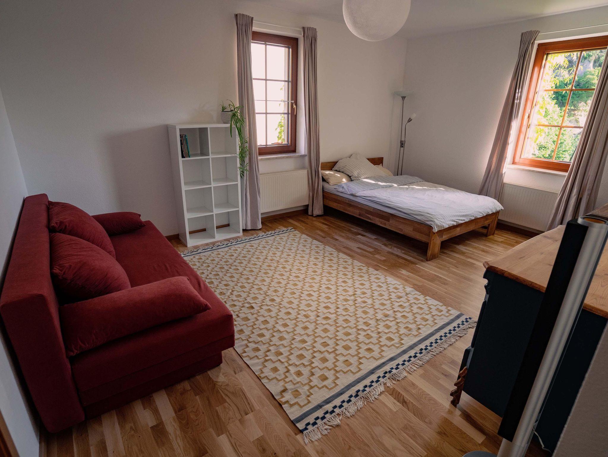 - Das Schlafzimmer „Bärenhöhle“ mit Doppelbett und bequemer Doppelschlafcouch.