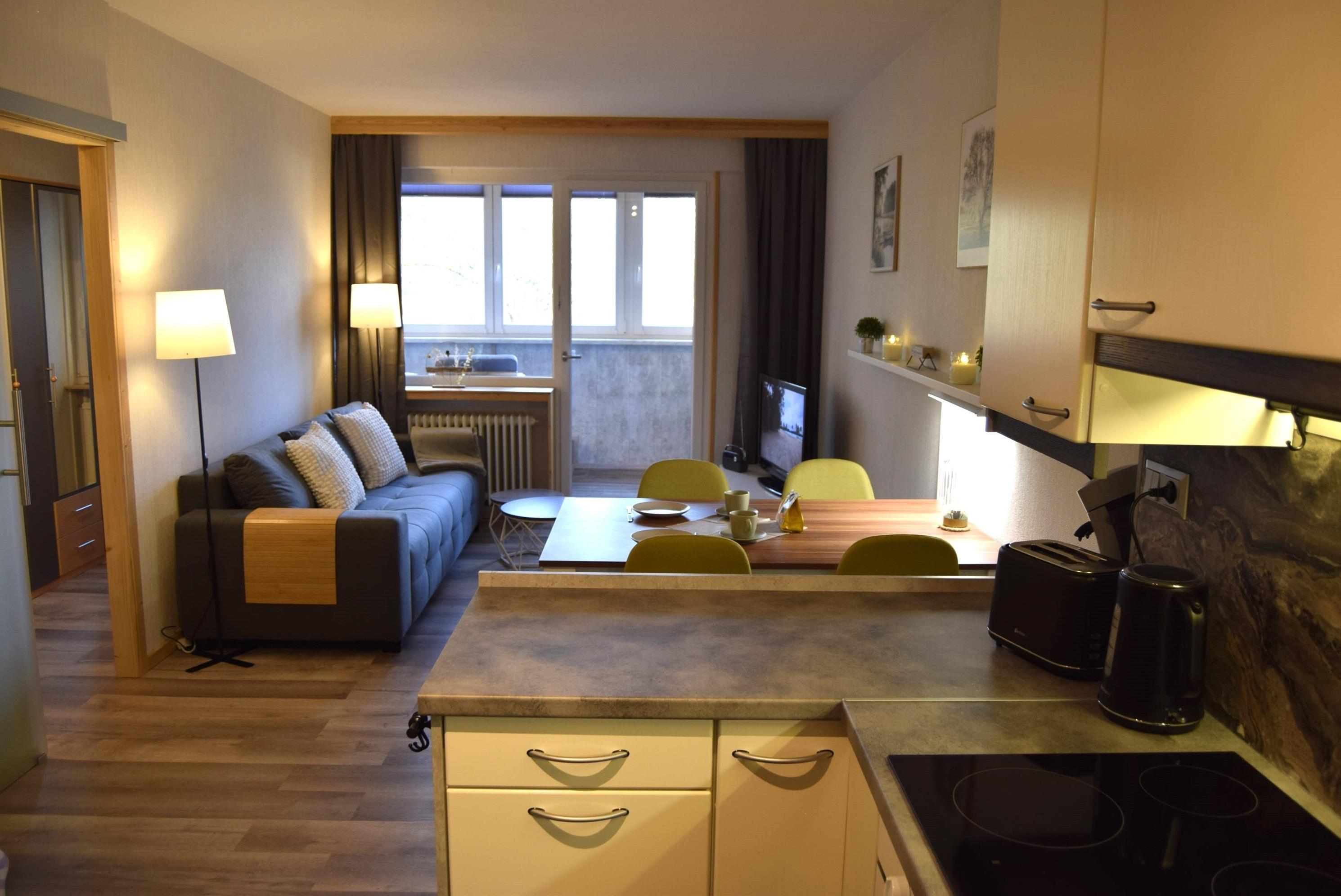 Das gemütliche Wohn- und Esszimmer mit offener Küche lädt zum Entspannen ein.
