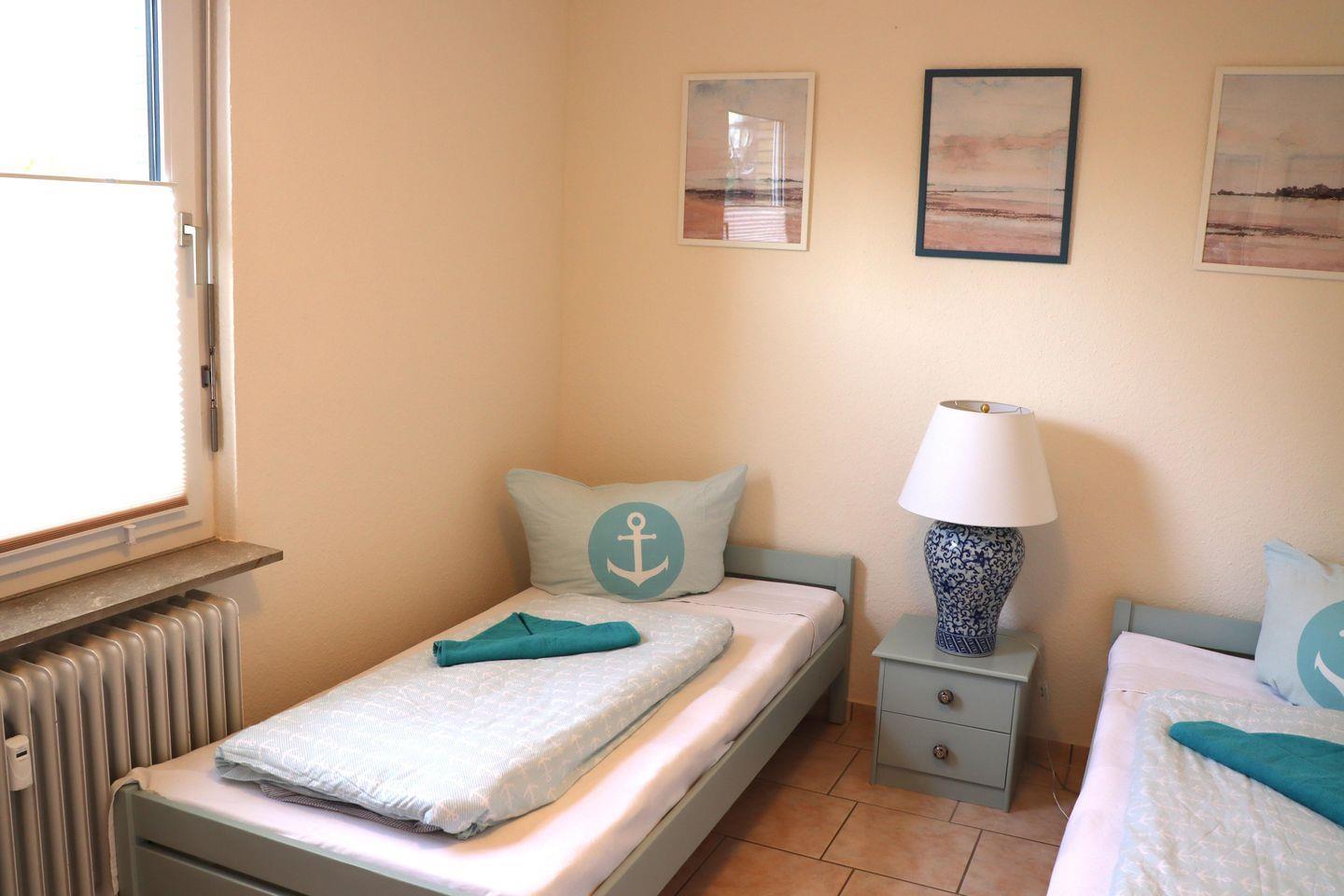 Die Ferienwohnung Borkum bietet Ihnen zwei geschmackvoll eingerichtete Schlafzimmer. Das Elternschlafzimmer ist mit einem gemütlichen Doppelbett ausgestattet und sorgt für erholsame Nächte. Das zweite Schlafzimmer, das sich nicht nur für Kinder eignet, ist mit zwei komfortablen Einzelbetten ausgestattet – ideal für Familien oder Freunde.