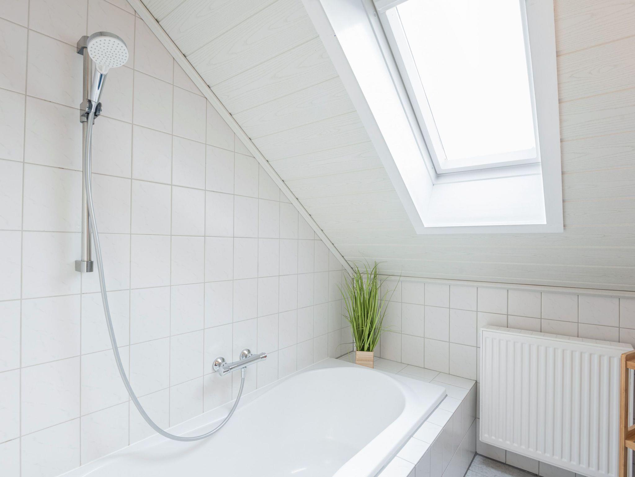 Die Unterkunft verfügt zudem über ein helles Tageslichtbad mit einer Badewanne inkl. Duschfunktion, Waschbecken und einem Föhn. Das WC befindet sich in einem separaten Raum.