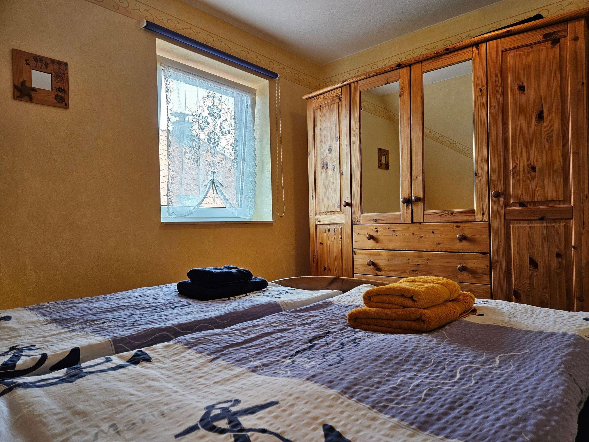 Die Nichtraucherwohnung Seestern ist komfortabel und gemütlich eingerichett. Sie befindet sich im Obergeschoß eines Einfamilienhauses mit zwei Ferienwohnungen. Sie bietet einen Schlafraum, einen großen Wohnraum mit Balkon, eine Küche mit Eßecke sowie ein helles Badezimmer mit Tageslicht. Flachbild-Fernseher, Blu-ray-Player und WLAN sind vorhanden. In der Küche stehen Geschirrspüler, Backofen, Wasserkocher, Mikrowelle sowie Kühlschränke mit Eisfach zur Verfügung.