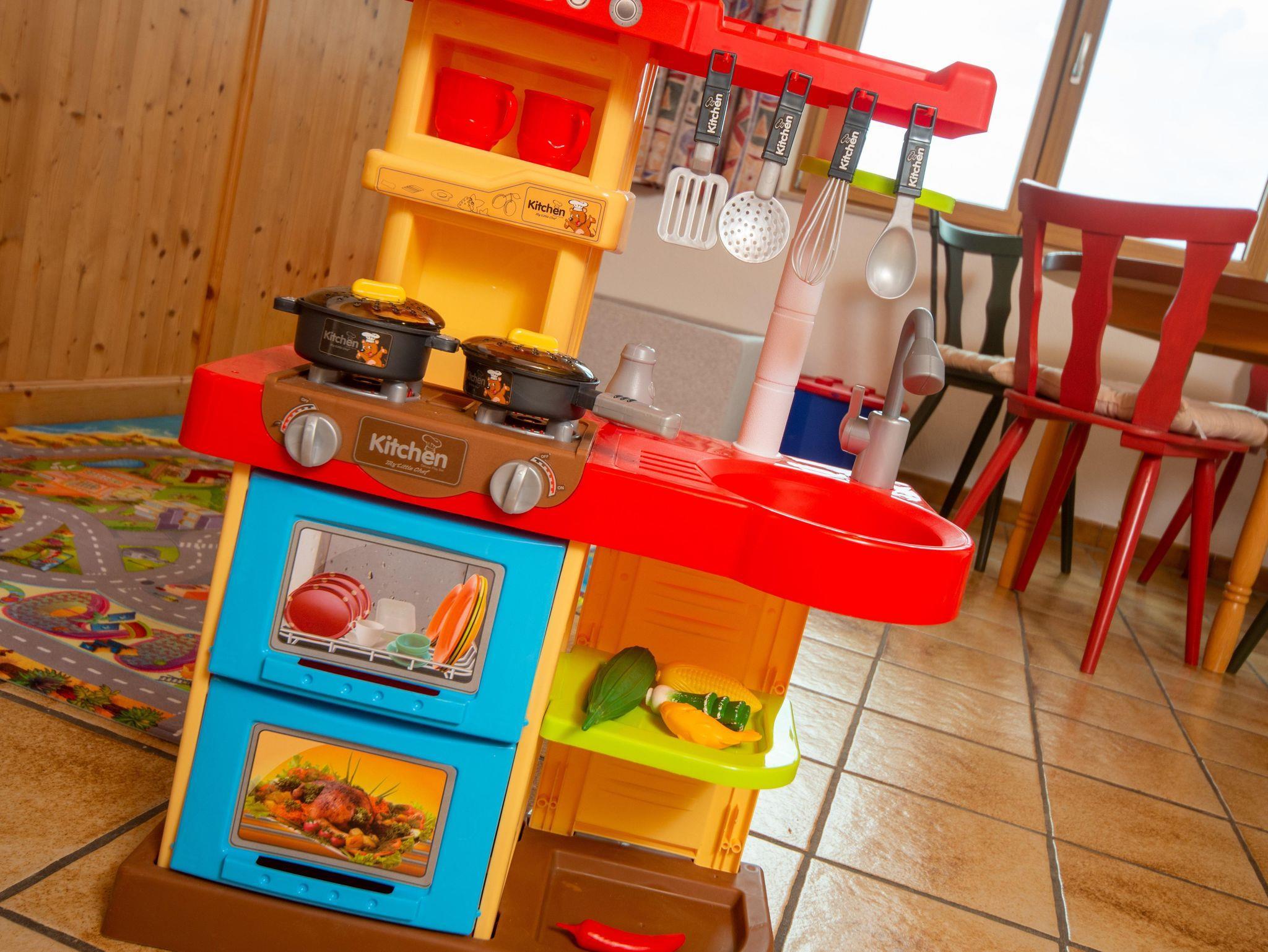 Der Wohnraum hat eine komplett ausgestattete Küchenzeile mit Geschirrspüler,Kühlschrank inkl. Gefrierfach,Herd mit Ceranfeld, Backofen, Mikrowelle, Wasserkocher, Eierkocher, Toaster, und Kaffeevollautomat, einen großen Esstisch, eine gemütliche Couchgarnitur, ein Flachbild-TV und einen CD-Player.