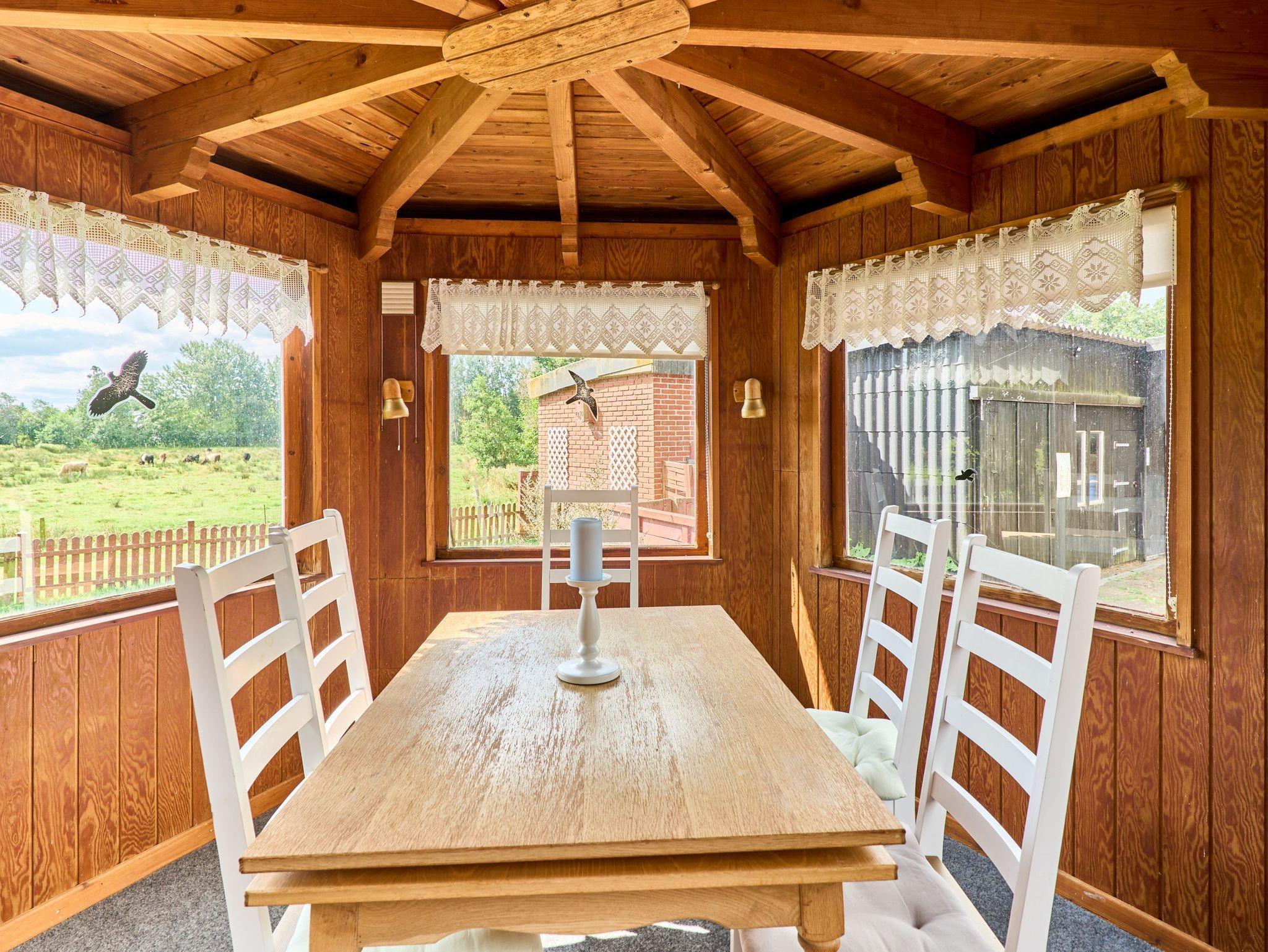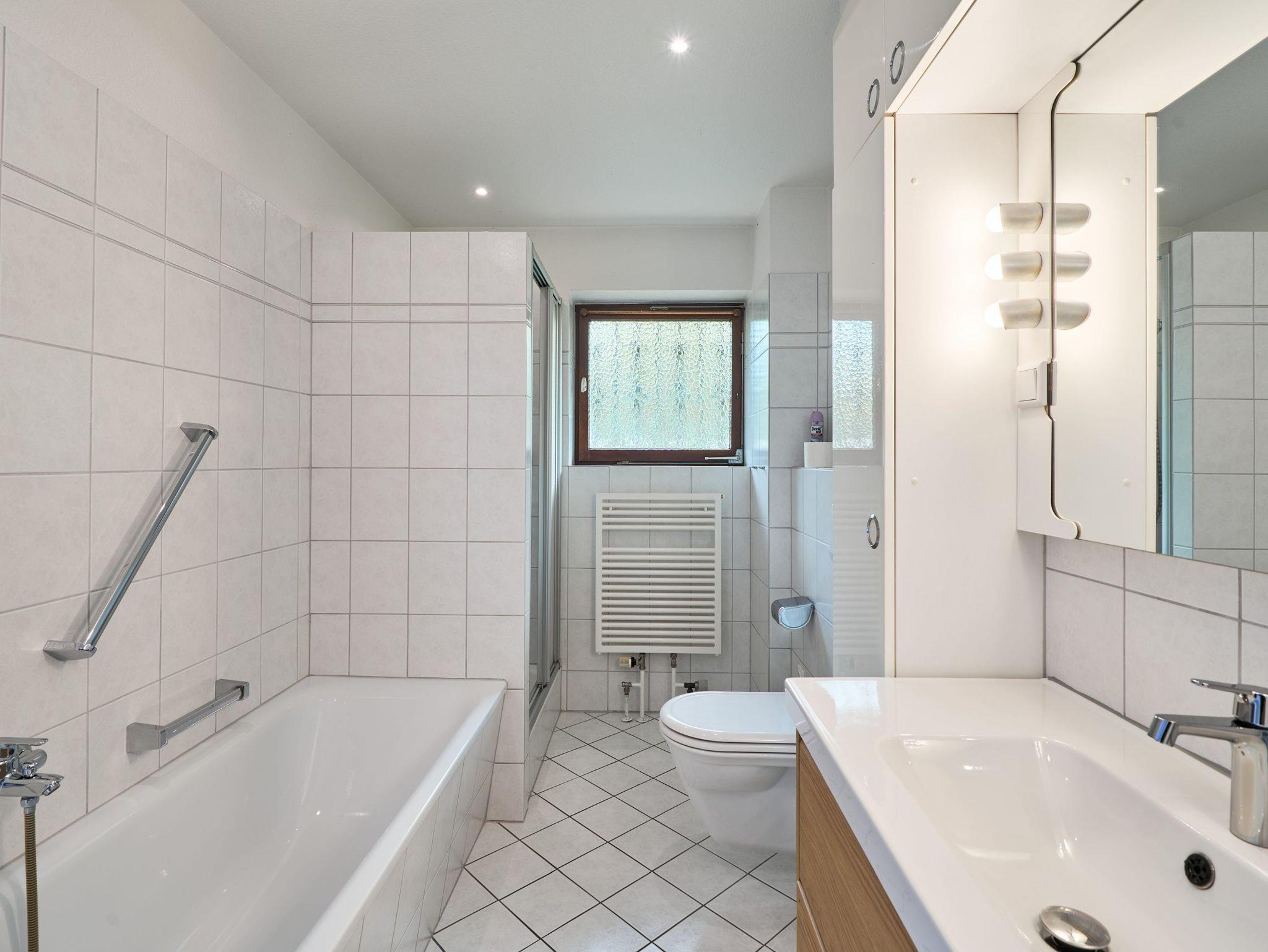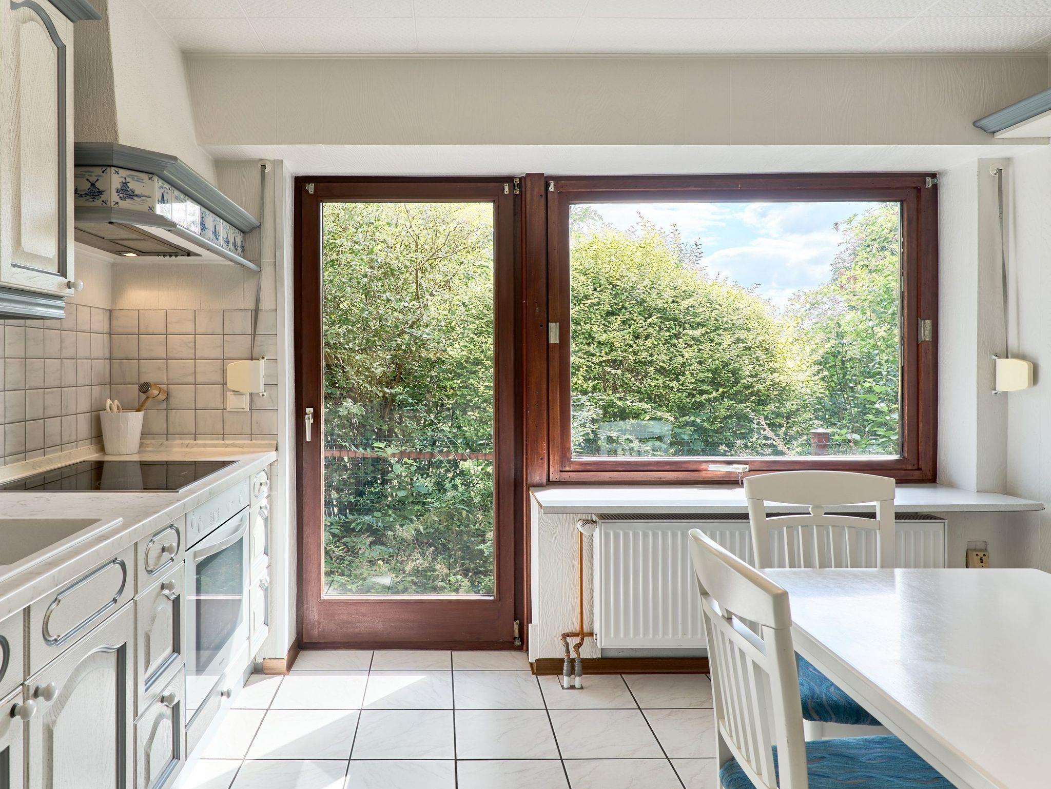 Im Erdgeschoss befinden sich auf 100 m² ein großer Wohn-/Essbereich, eine Küche mit Speisekammer, Duschbad, Gäste-WC und 2 Schlafzimmer für 4 Personen ausreichend Platz. Das Panoramafenster im großen Wohnzimmer bietet weiten Blick über die Wiesen.