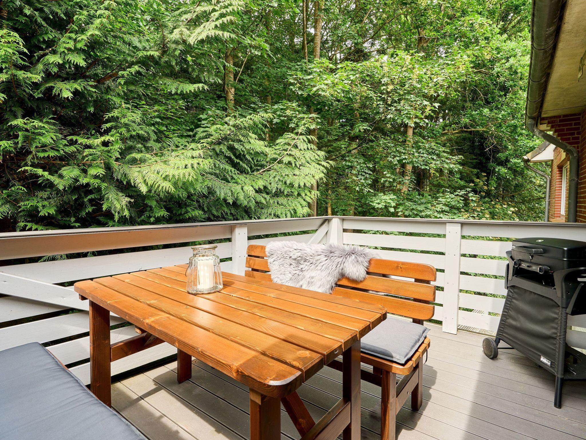 Sowohl von der Küche als auch dem Esszimmer erreichen Sie den großzügigen, terrassenartigen Balkon, hier steht für Sie ein Gasgrill und Gartenmöbel bereit.