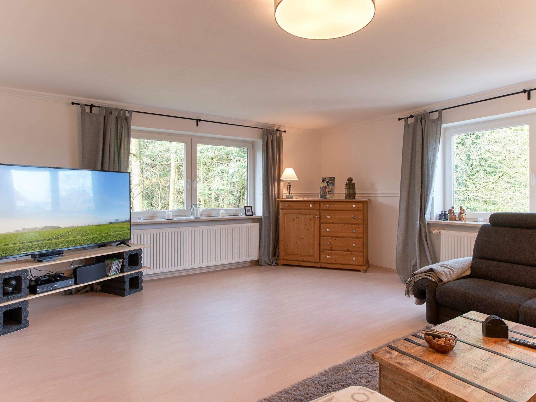 Wohnzimmer mit sehr großem gemütlichem Sofa und 65 Zoll Smart-TV, separates Gäste-WC und