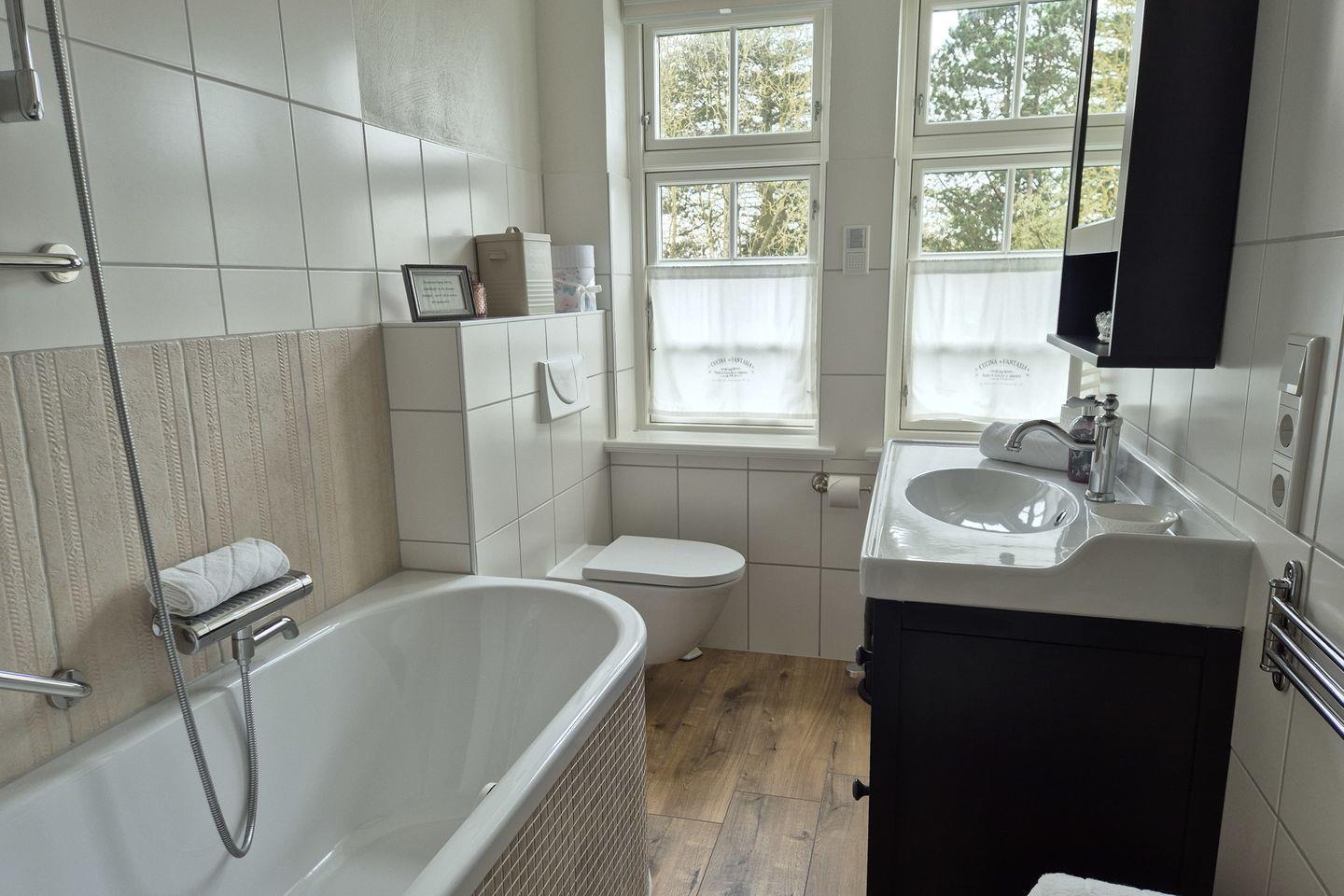 Das moderne Badezimmer ist mit einer Badewanne (mit Duschvorrichtung), einem Handwaschbecken, WC und einer Waschmaschine eingerichtet.