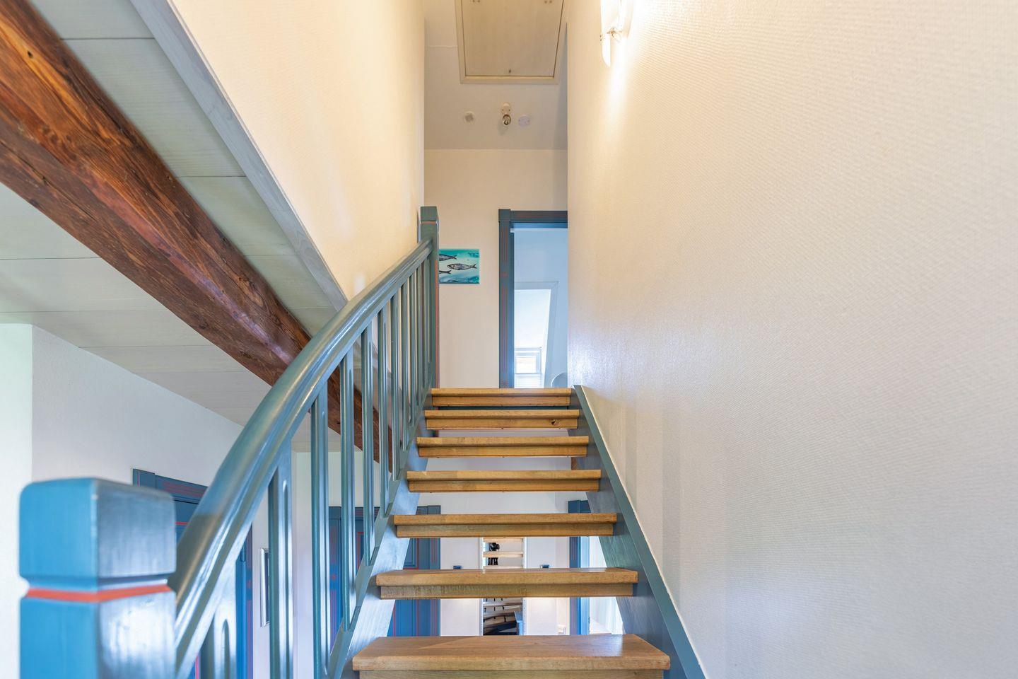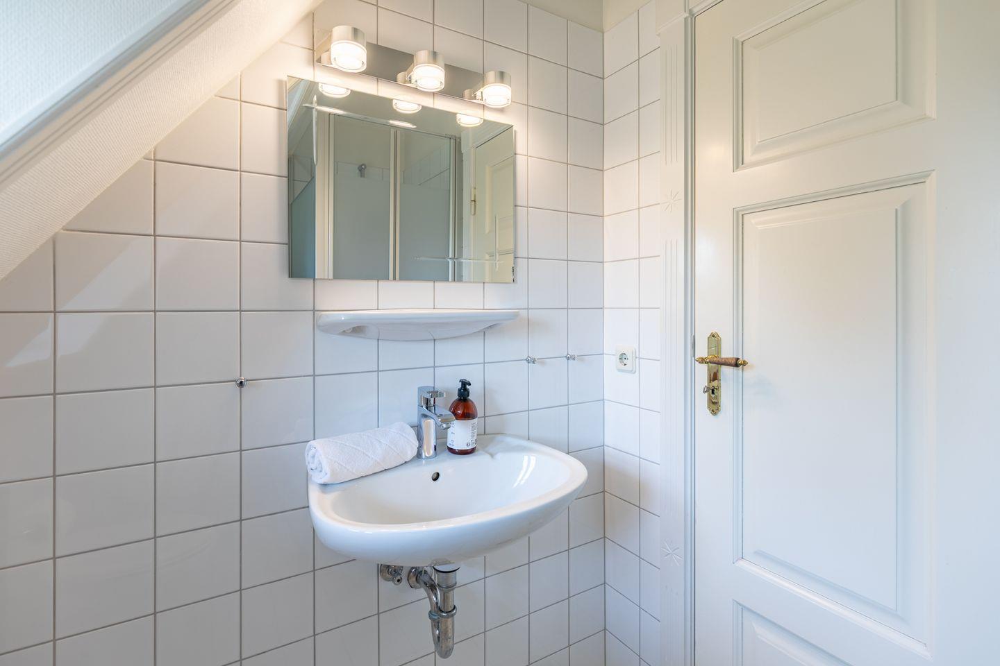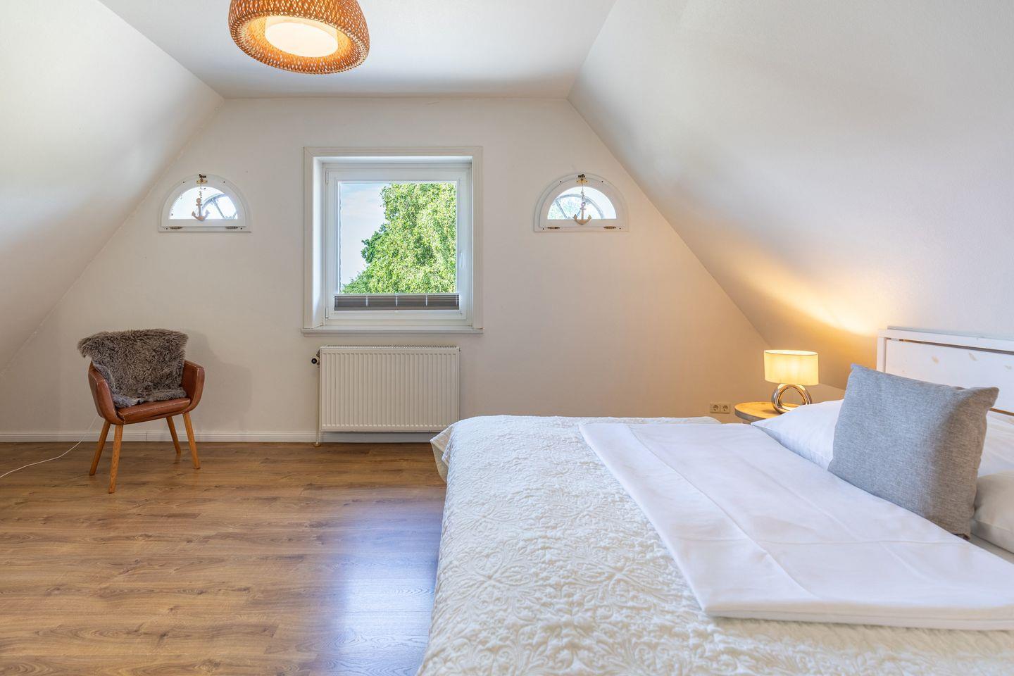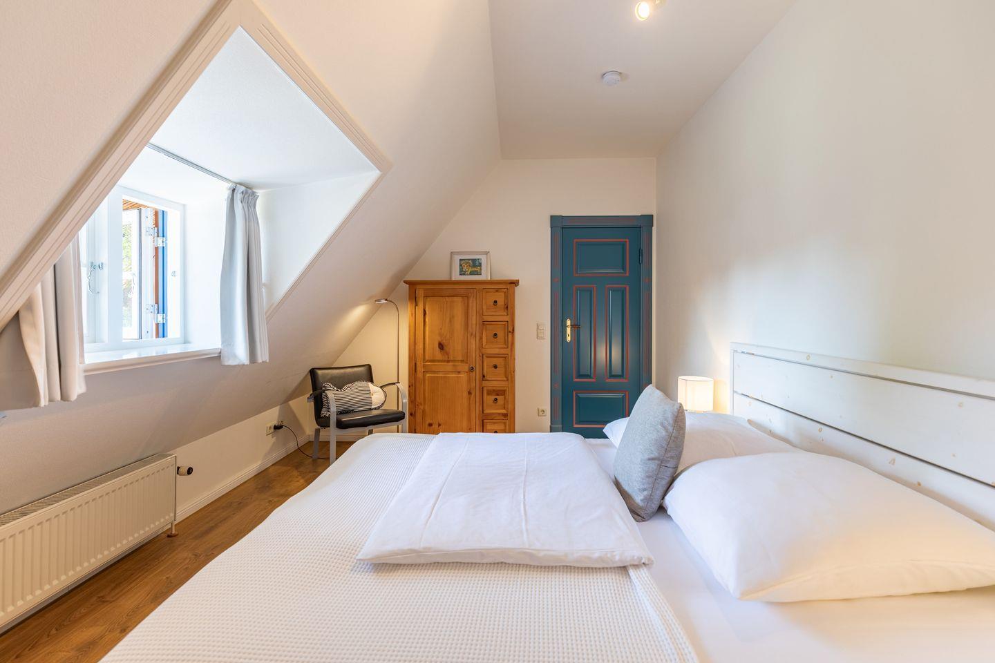 Im OG befinden sich zwei Schlafzimmer – eines davon mit TV und Meerblick – und jeweils einem Doppelbett (180 x 200) und ein Duschbad mit WC.
