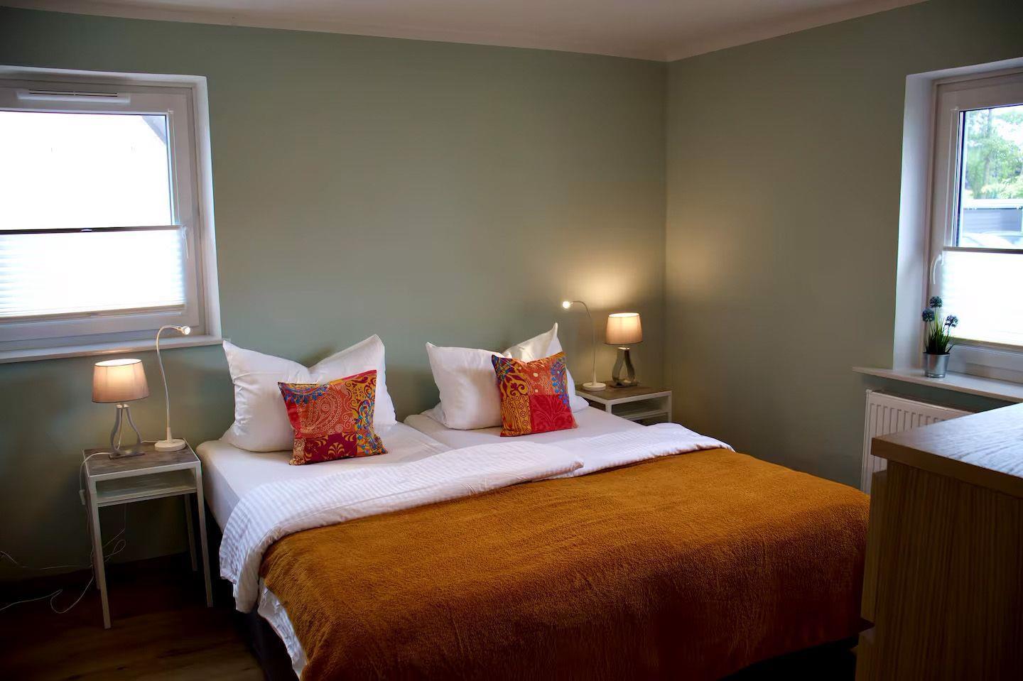 Im Obergeschoss liegt das Schlafzimmer mit einem komfortablen King-Size-Bett. Fliegengitter an den Fenstern sorgen in den Sommermonaten für eine angenehme Nachtruhe. Das moderne Bad ist mit Dusche und WC ausgestattet.
