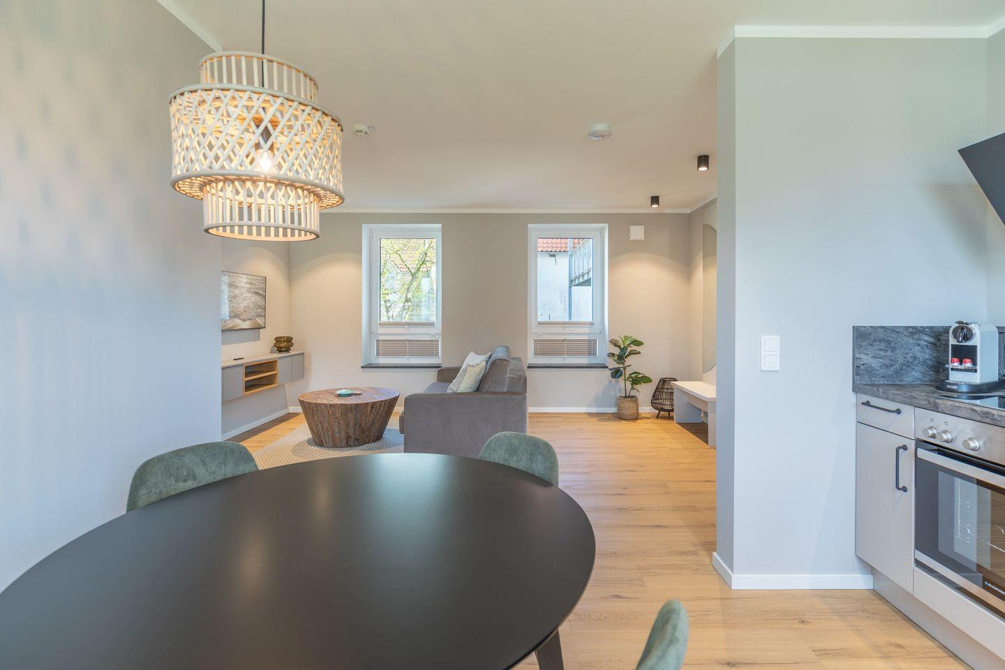 Direkt angeschlossen befindet sich die offene Küche mit Essbereich, Kühlschrank (mit Gefrierfach), Herd, Backofen, Spülmaschine (Tabs inklusive), Kaffeemaschine, Wasserkocher, Besteck, Geschirr plus Töpfe & Pfannen.