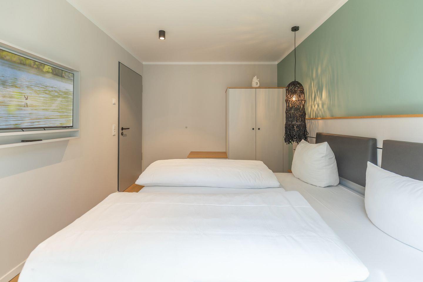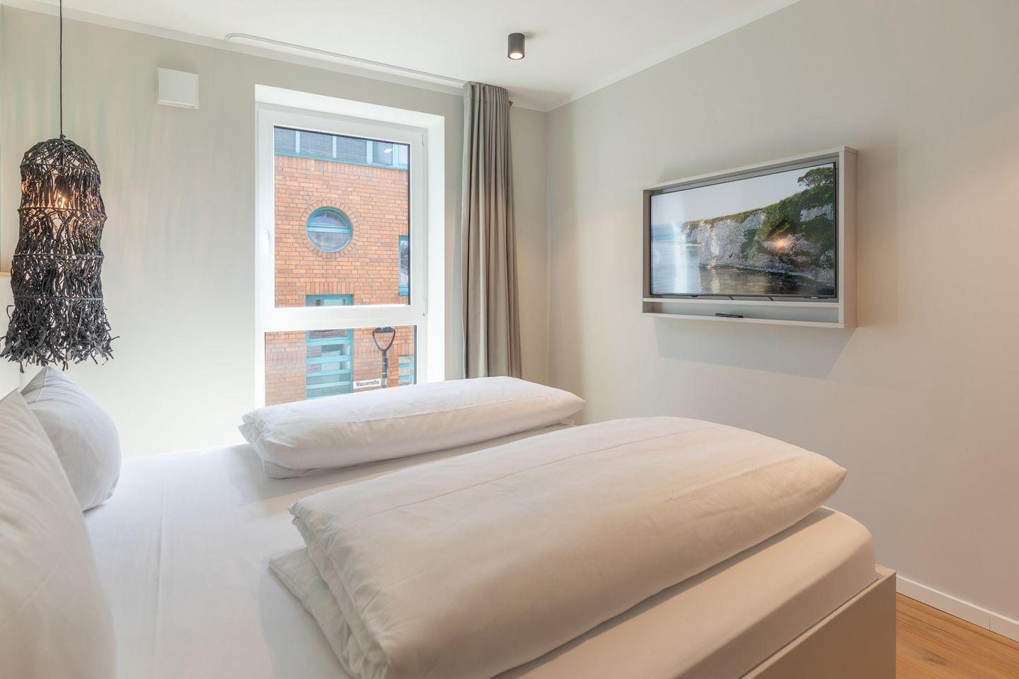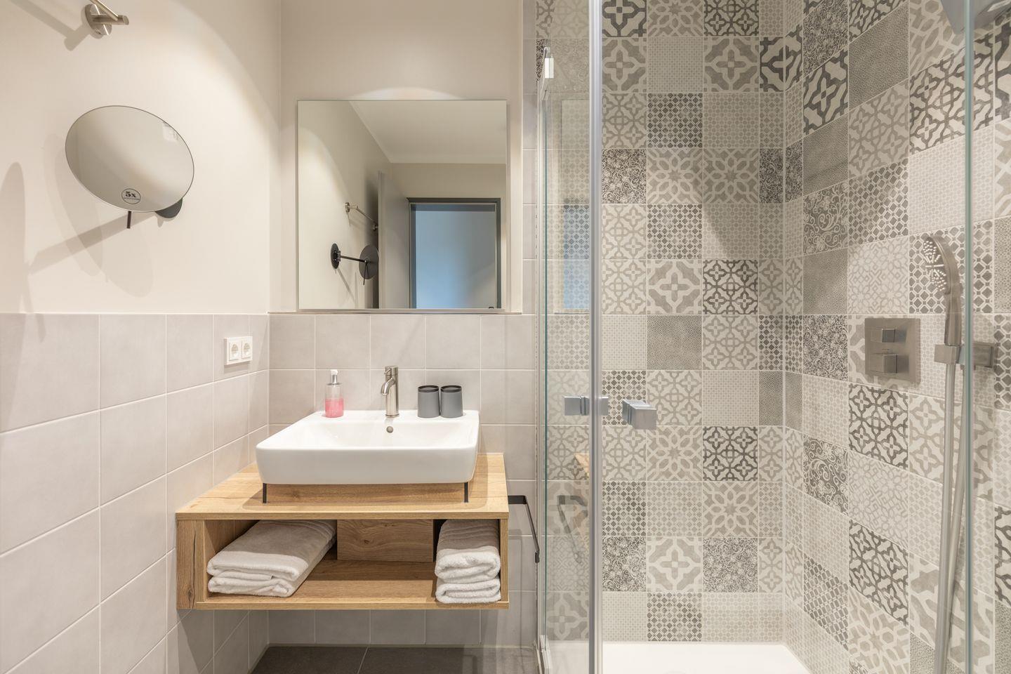 Das Badezimmer verfügt über eine ebenerdige Dusche, WC, Kosmetikspiegel und Föhn. Zudem ist das Apartment komplett mit Fußbodenheizung ausgestattet und bietet im Schlafzimmer Verdunkelungsgardinen für einen entspannten Schlaf. Alle Apartments in den oberen Etagen sind über einen Aufzug erreichbar.