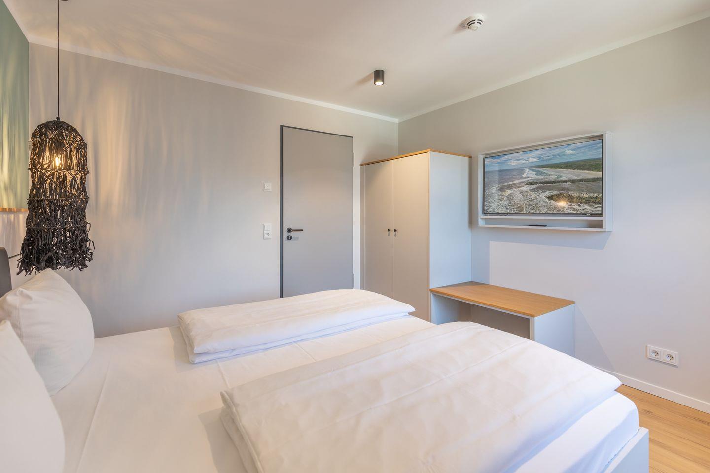 Das Schlafzimmer ist mit einem bequemen Doppelbett und einem weiteren TV ausgestattet.