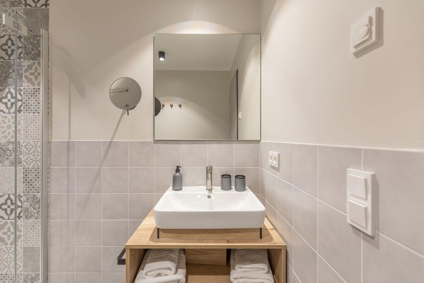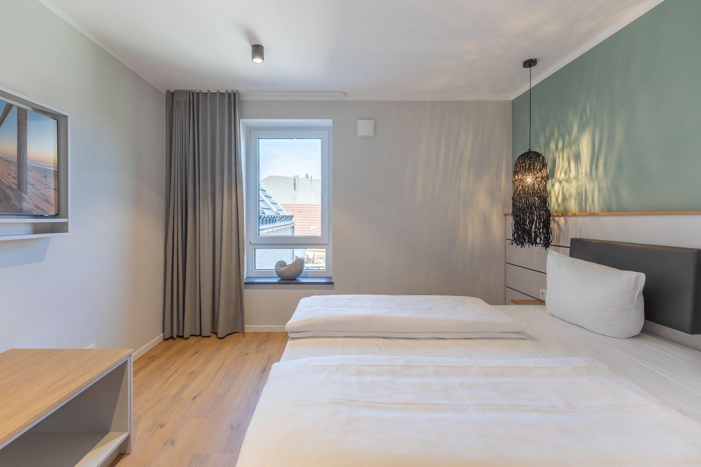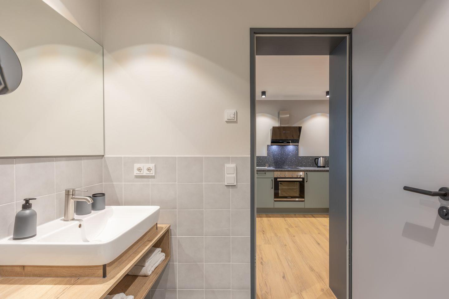 Das Badezimmer verfügt über eine ebenerdige Dusche, WC, Kosmetikspiegel und Föhn. Zudem ist das Apartment komplett mit Fußbodenheizung ausgestattet und bietet im Schlafzimmer Verdunkelungsgardinen für einen entspannten Schlaf. Alle Apartments in den oberen Etagen sind über einen Aufzug erreichbar.