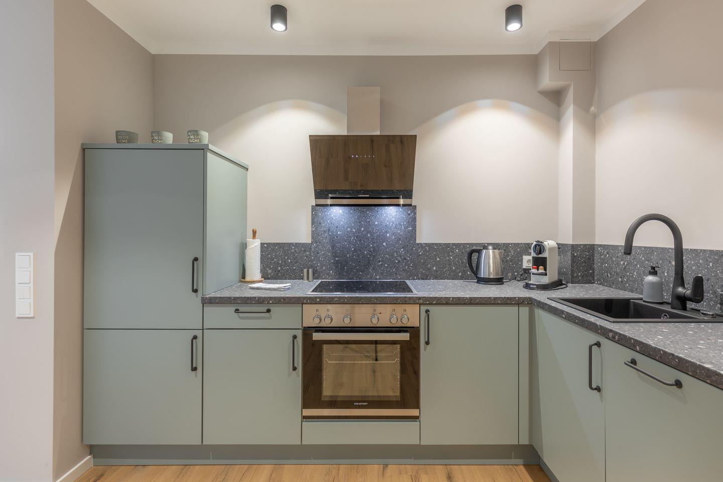 Direkt angeschlossen befindet sich die offene Küche mit Essbereich, Kühlschrank (mit Gefrierfach), Herd, Backofen, Spülmaschine (Tabs inklusive), Kaffeemaschine, Wasserkocher, Besteck, Geschirr plus Töpfe & Pfannen.