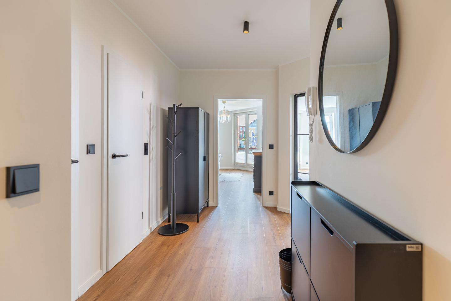 Das Badezimmer ist modern ausgestattet und in hellen, zeitlosen Farben gehalten. Hochwertige Fliesen, eine strukturierte Wandgestaltung und schwarze Akzente bei Armaturen und Accessoires verleihen dem Raum ein stimmiges und klares Erscheinungsbild. Die großzügige Dusche ist mit einer Regenbrause und zusätzlicher Handbrause ausgestattet und durch eine Glasabtrennung elegant vom restlichen Bereich getrennt. Ein Handtuchheizkörper rundet die funktionale Ausstattung ab. In einem separaten und gleich hochwertig gestalteten Raum, befindet sich, getrennt vom Badezimmer, die Toilette mit Waschbecken.
