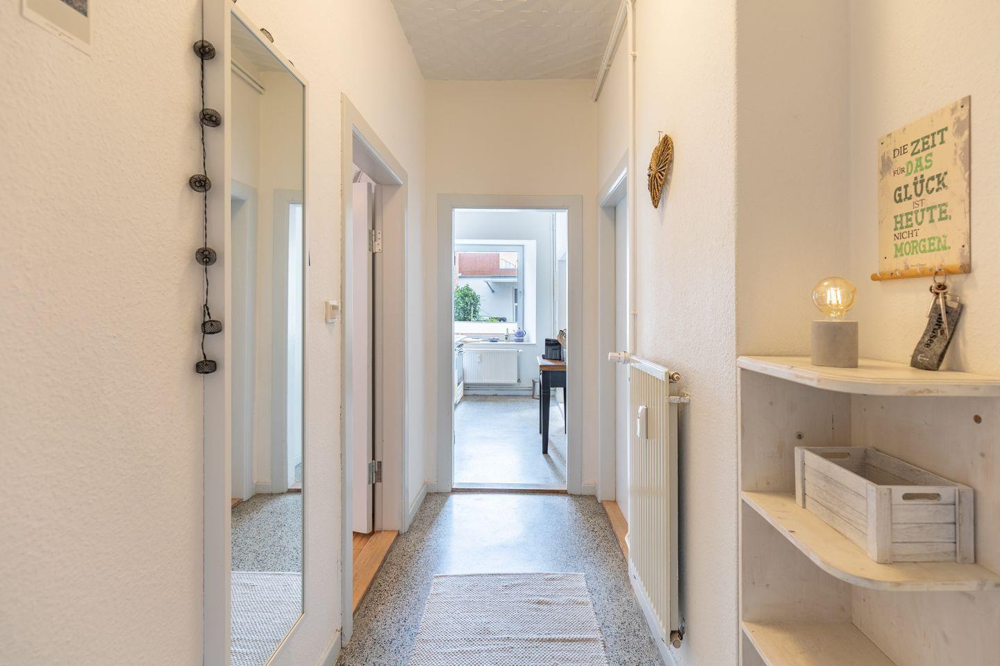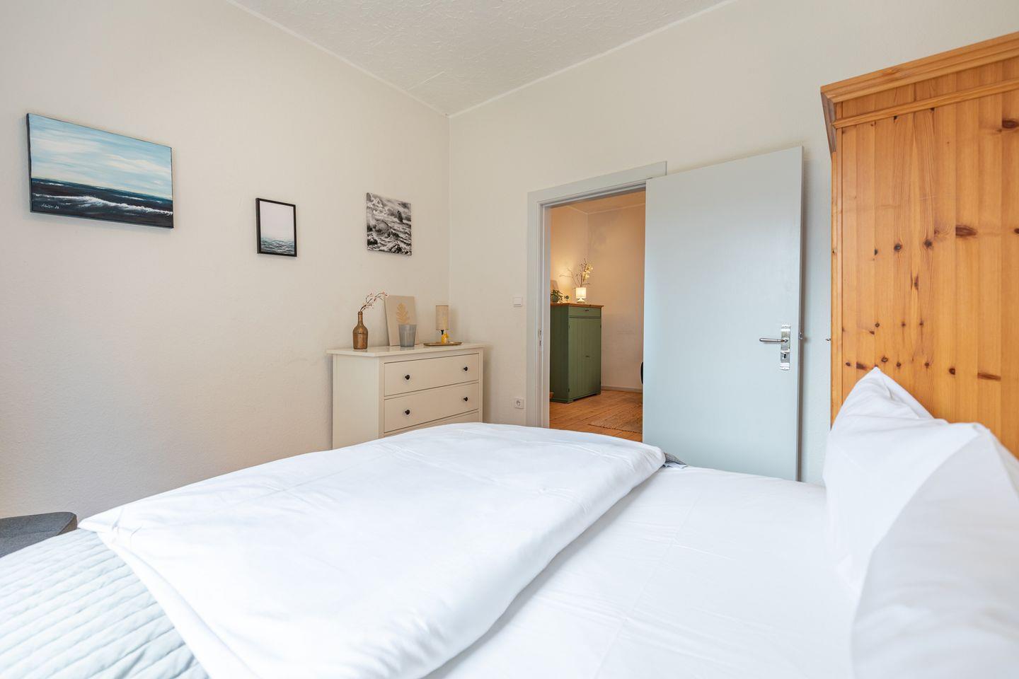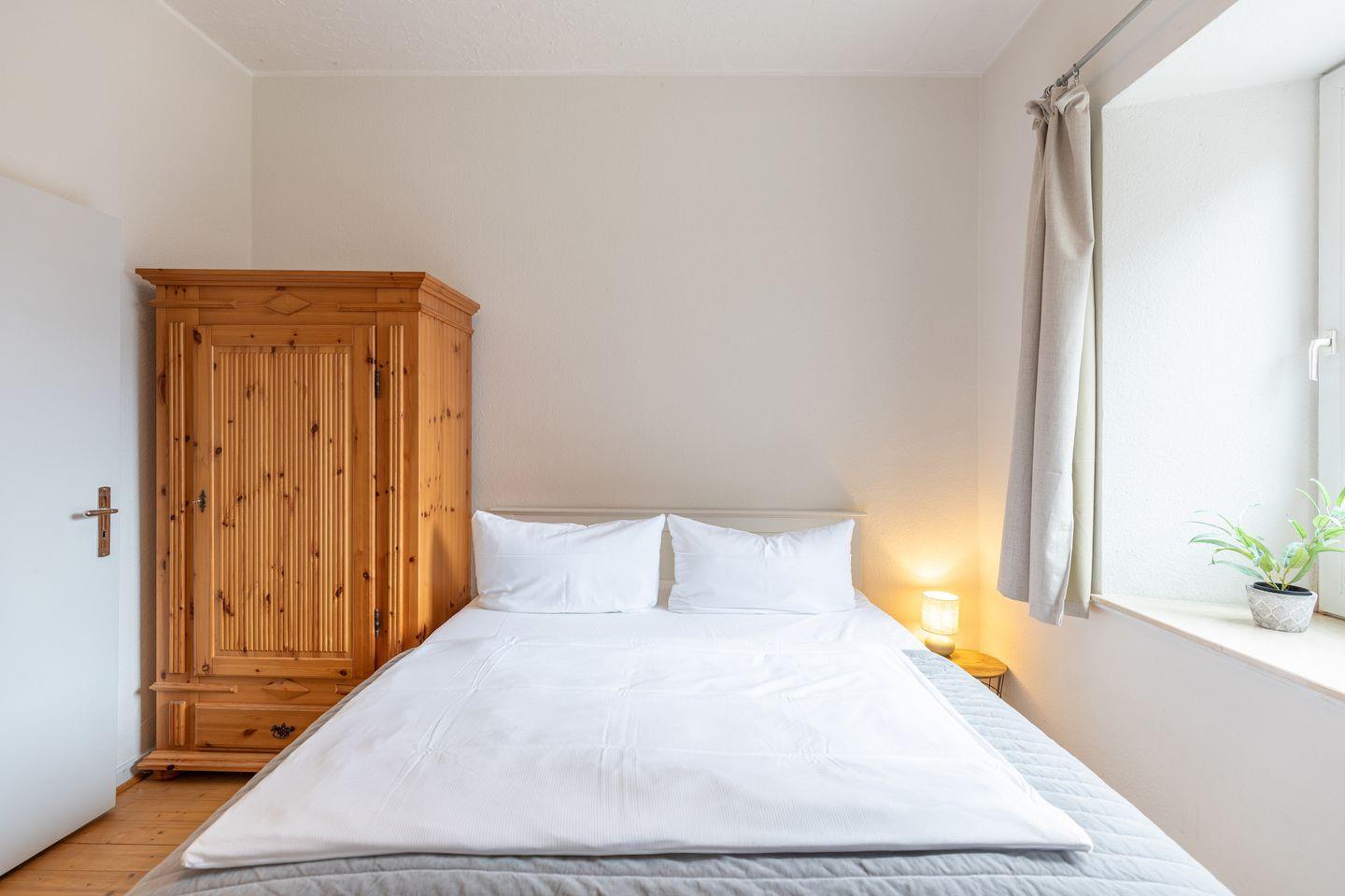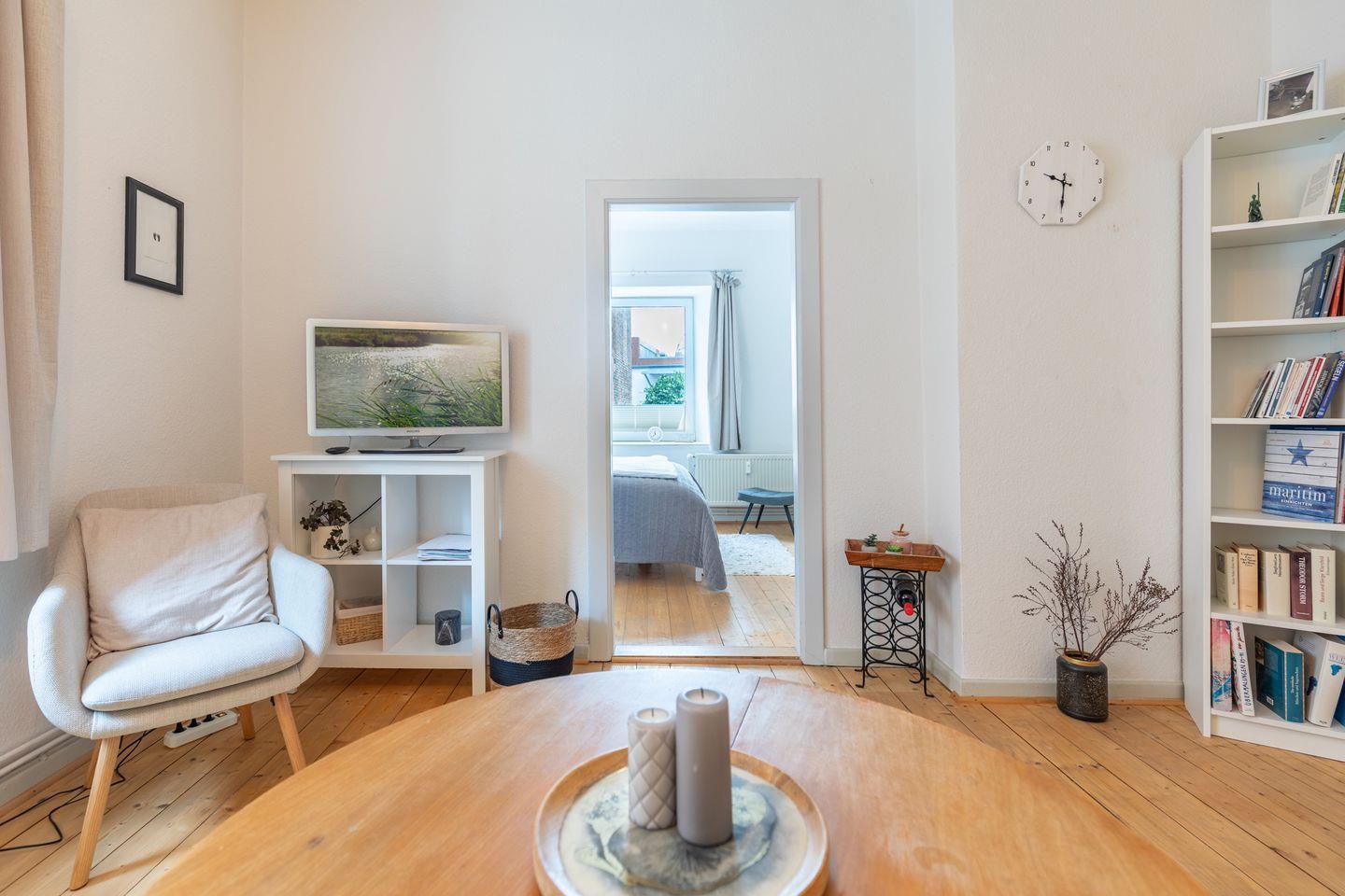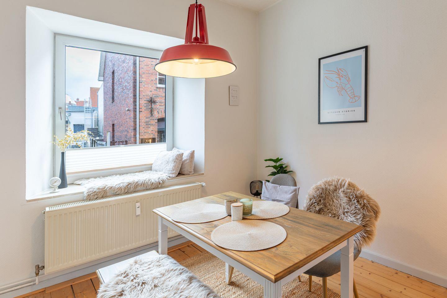Die 50 m² große Wohnung bietet Platz für zwei Personen und verfügt über eine voll ausgestattete Küche, ein gemütliches Esszimmer mit Blick auf die Husumer Fußgängerzone, ein modernes Badezimmer mit Dusche und WC, ein behagliches Wohnzimmer sowie ein Schlafzimmer mit Doppelbett (160x200) und hochwertigen Matratzen.