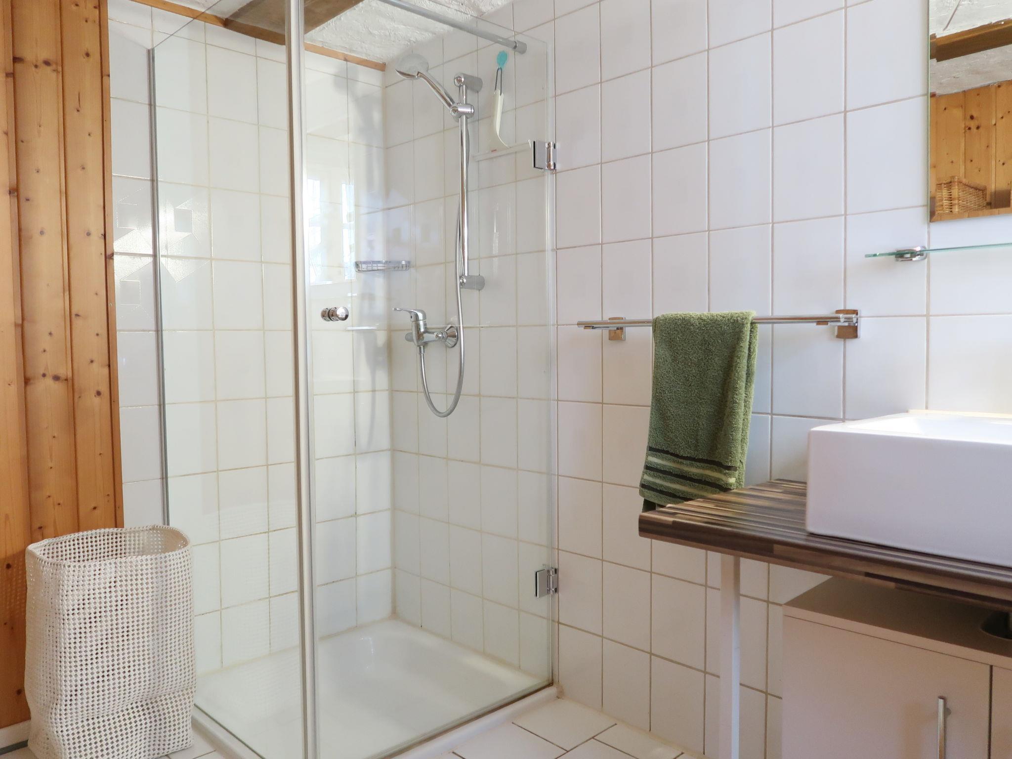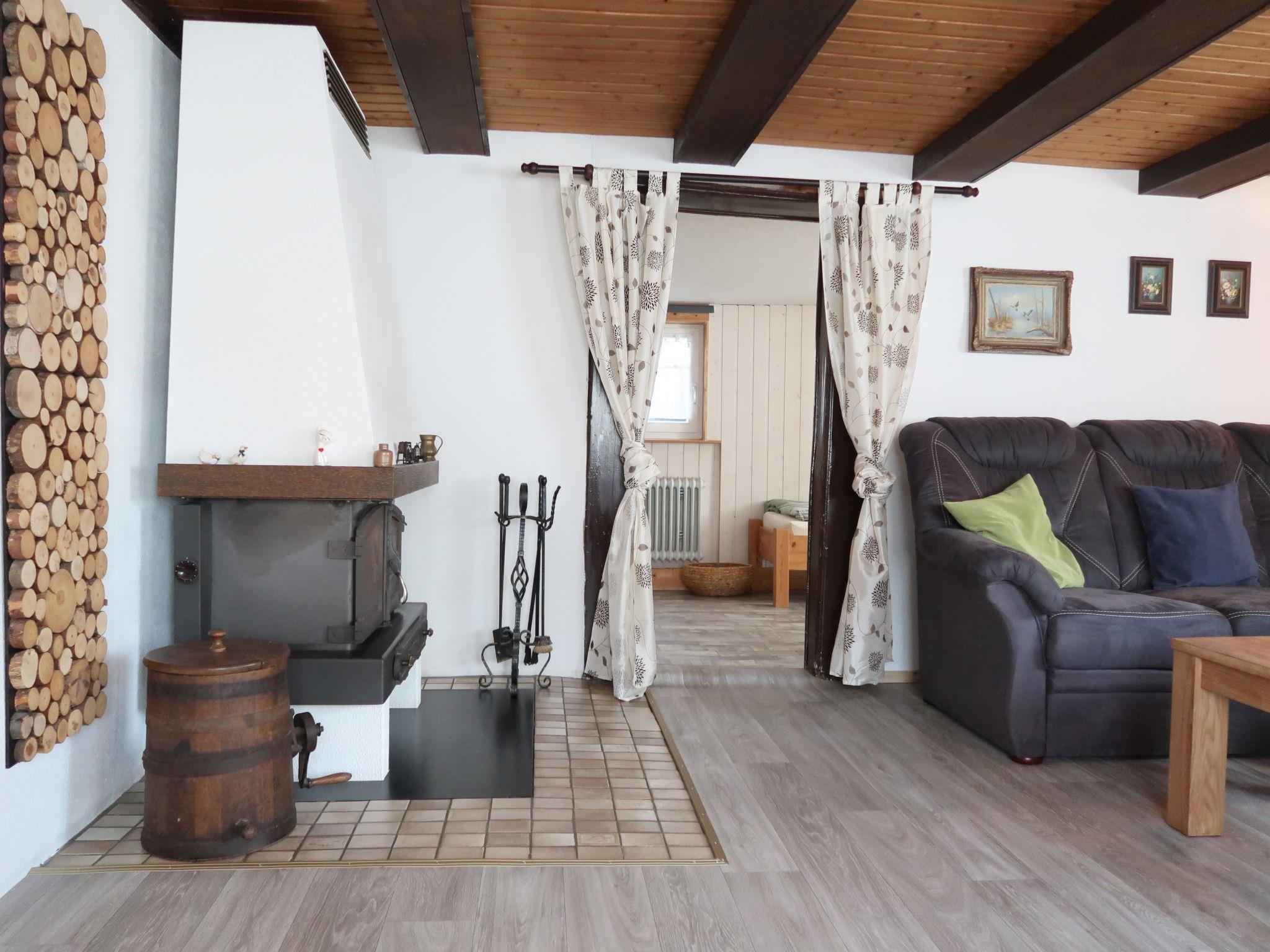 5-room house 135 m2 on 2 levels, on the ground floor. Living room with satellite TV (flat screen), radio and CD-player. 1 room with 1 bed. 1 double bedroom. Kitchen-/living room (oven, dishwasher, 4 ceramic glass hob hotplates, microwave, electric coffee machine) with dining table. Shower/WC. Upper floor: 2 double bedrooms. Shower/WC. Box-room. Facilities: washing machine, iron, children's high chair, logs (free). Internet (WiFi, free). Please note: non-smoking house. Maximum 2 pets/ dogs allowed. Lounge with tiled stove and 80 cm TV with 200 domestic and international channels. Access to the single bedroom through the lounge. One of the 2 double bedrooms has an open timbered wall separating it from a nursery with cot and changing table. Comfortable seating corner in the hall on the top floor.