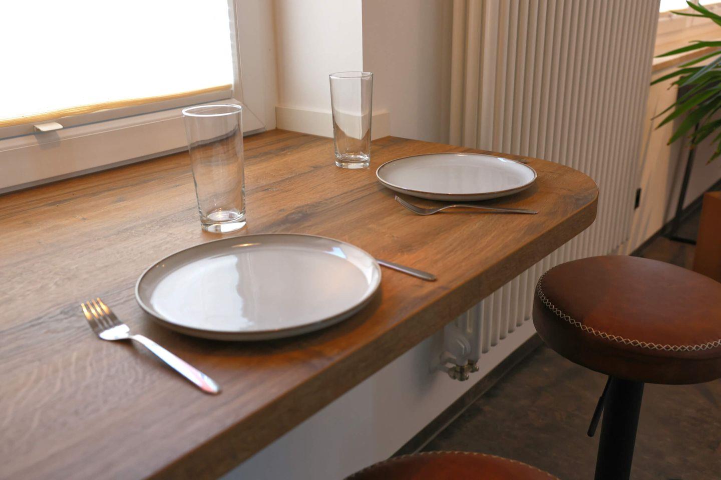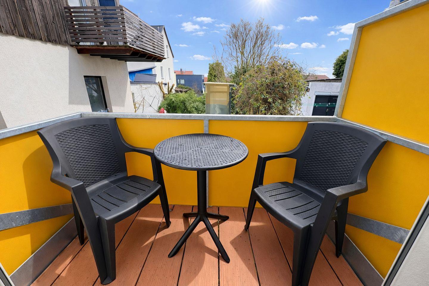 Auf rund 50 m² erwarten dich ein stilvoll eingerichtetes Wohnzimmer, ein ruhiges Schlafzimmer mit bequemem Doppelbett sowie einem ausziehbaren Zusatzbett. Vom Schlafzimmer aus gelangst du auf den kleinen Balkon mit Blick in den grünen Hinterhof – perfekt für einen entspannten Start in den Tag mit einer Tasse Kaffee. Die Wohnung liegt im Parterre und ist dadurch besonders bequem zugänglich. Zusätzlich steht dir ein ruhiger Arbeitsplatz mit komfortablem Arbeitsstuhl zur Verfügung – ideal für produktive Stunden für Remote-Arbeit.