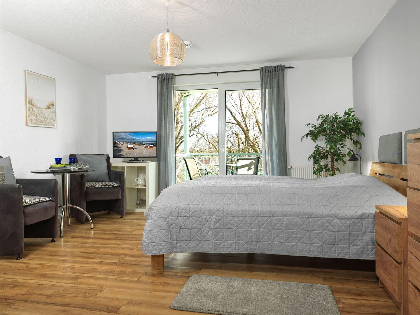 Vom gemütlich ausgestattetem Wohn- und Schlafzimmer für 2 Personen Platz mit Flach-TV gelangen Sie auf den Balkon mit herrlichem, seitlichem Meerblick.