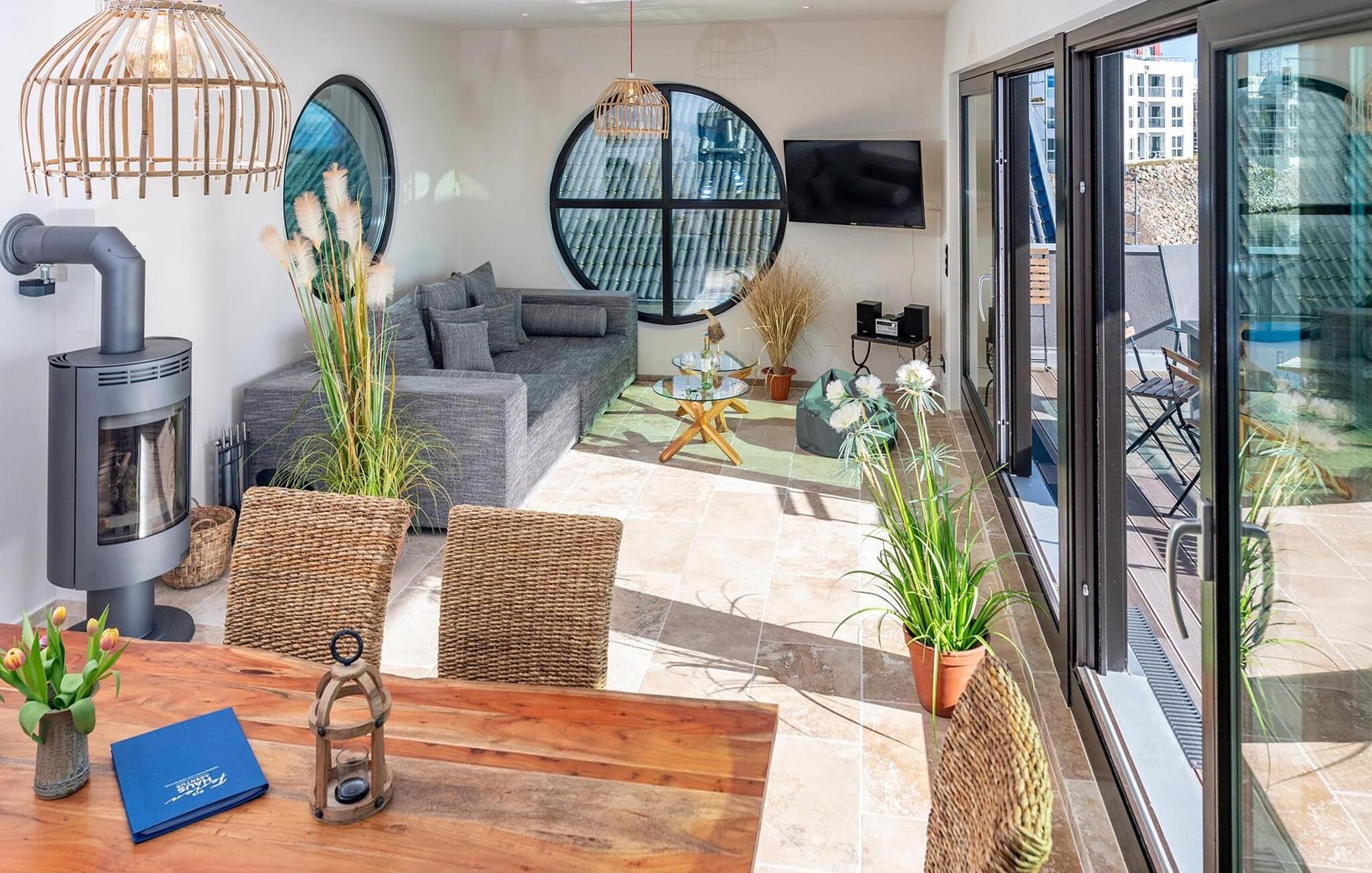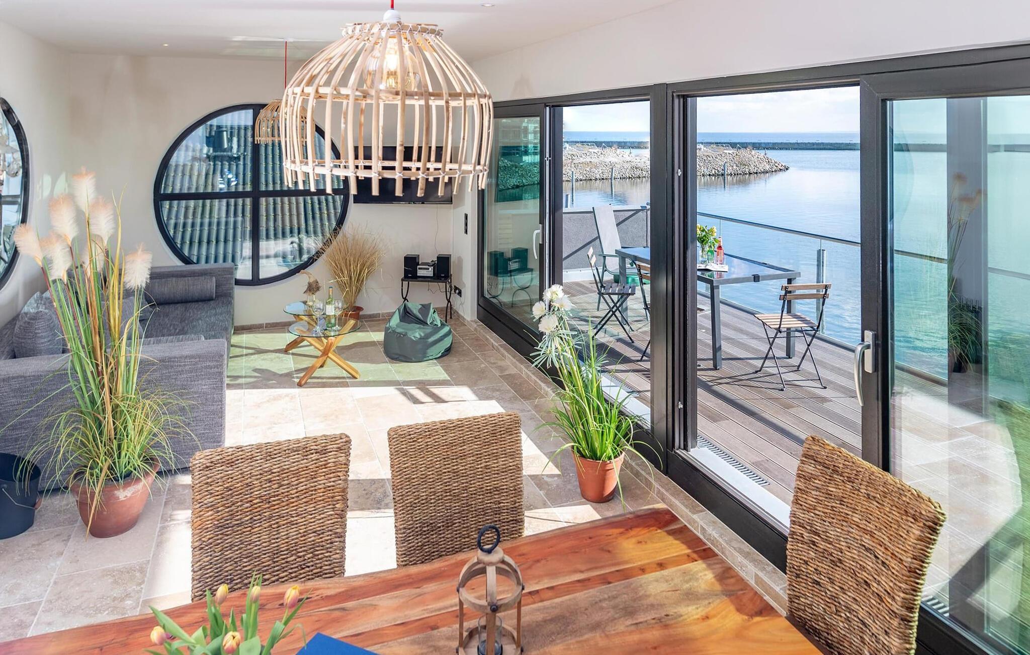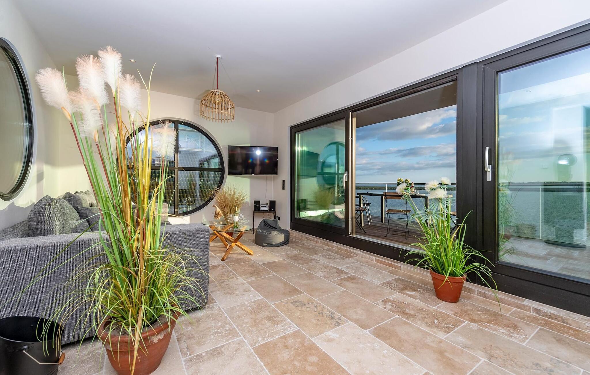 Den rymliga terrassen vid marinan ligger i söderläge och lovar sol hela dagen, medan braskaminen och golvvärmen i hela semesterlägenheten garanterar en behaglig komfort under alla årstider.