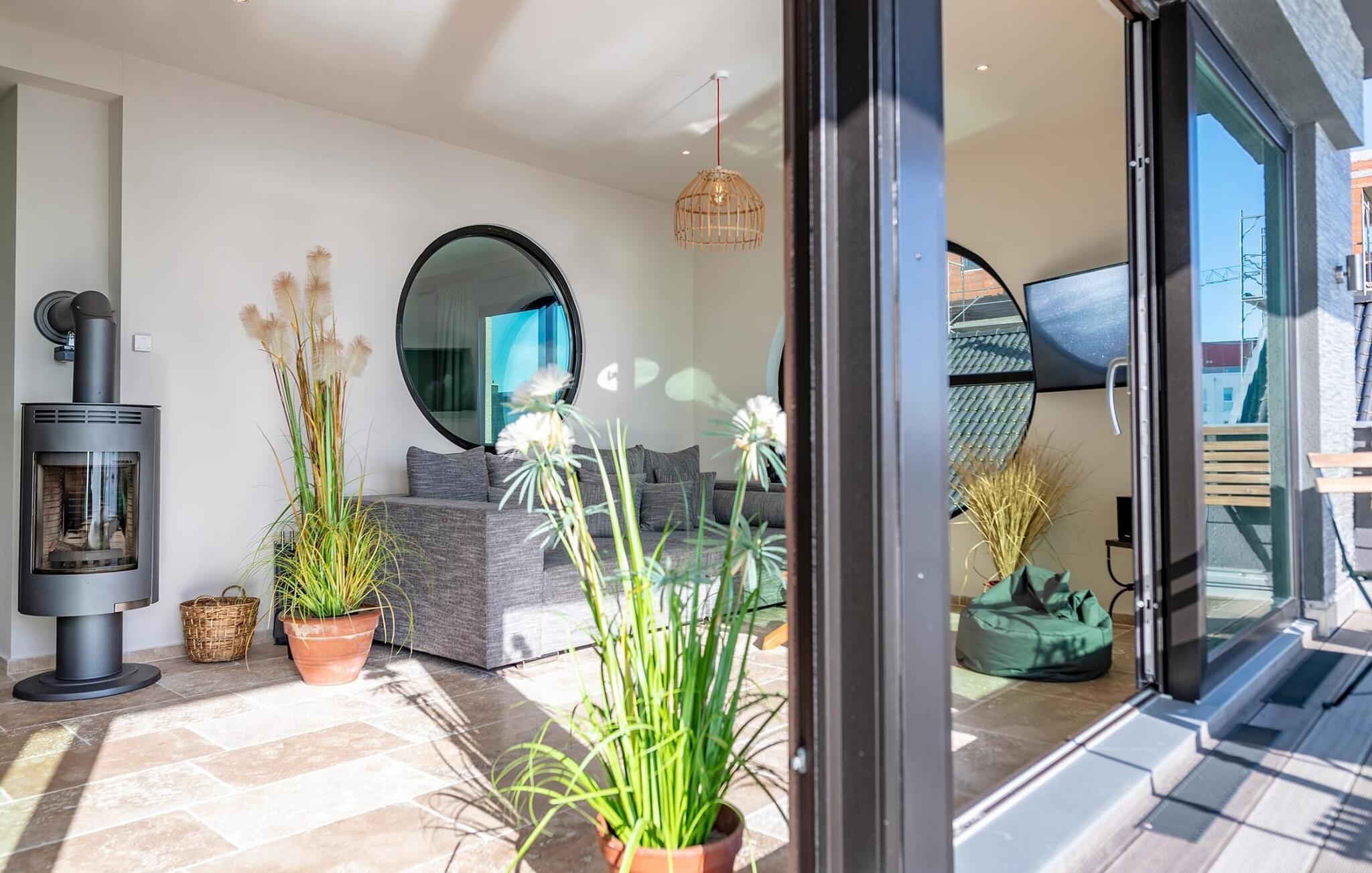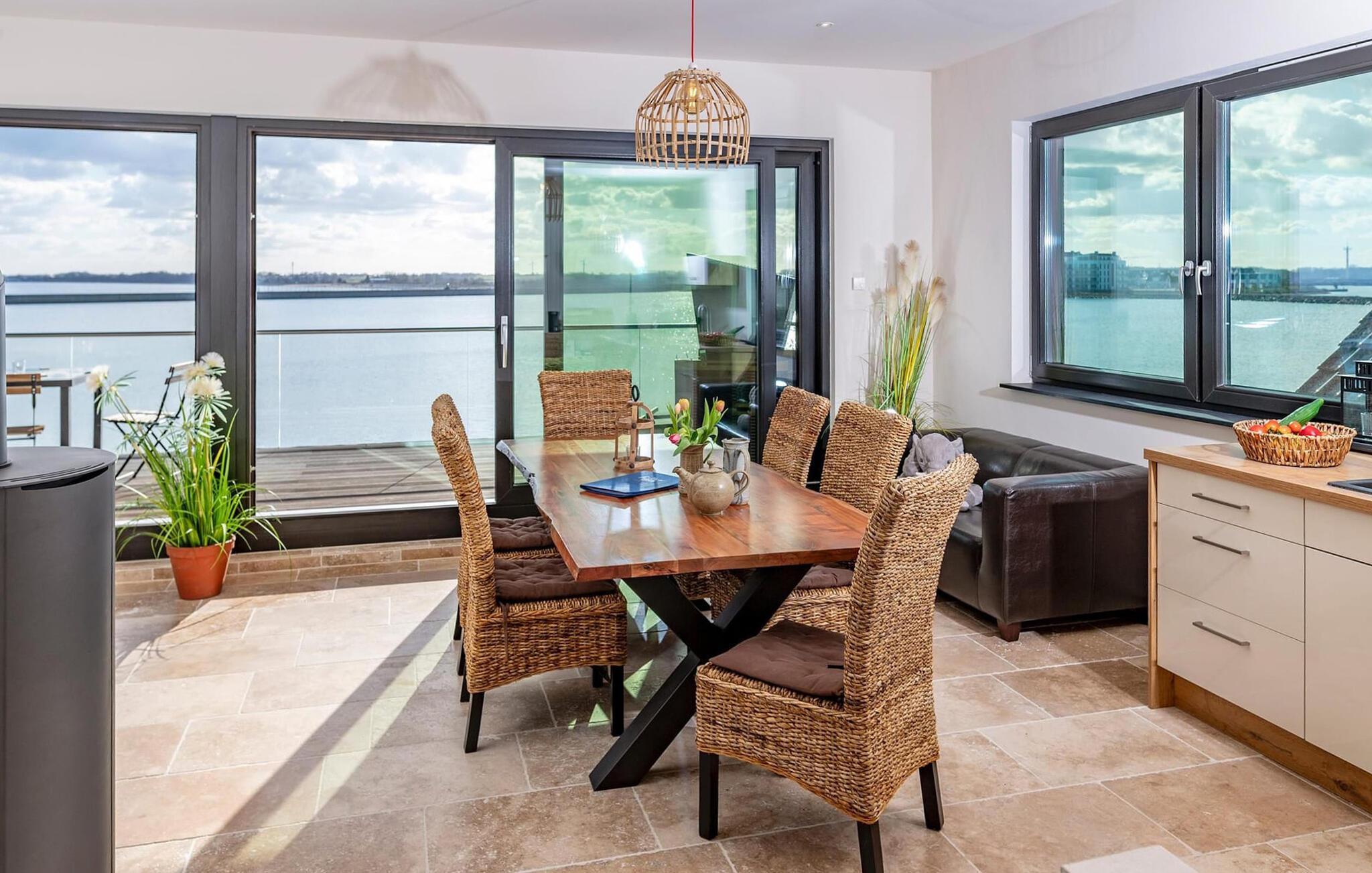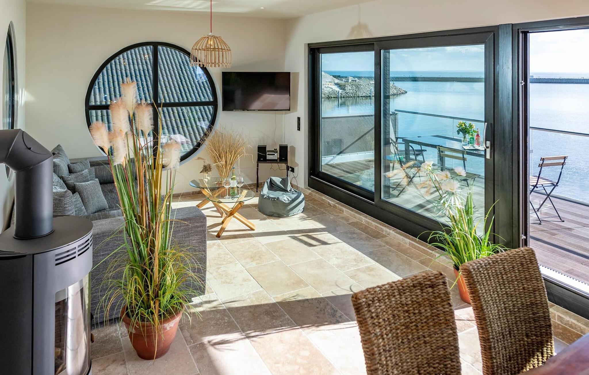 Den rymliga terrassen vid marinan ligger i söderläge och lovar sol hela dagen, medan braskaminen och golvvärmen i hela semesterlägenheten garanterar en behaglig komfort under alla årstider.