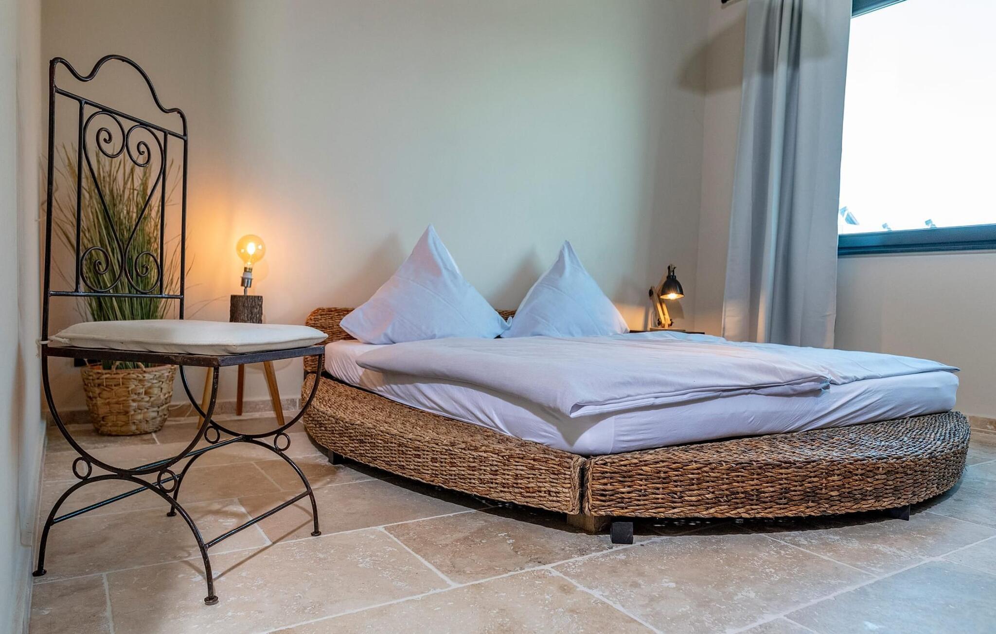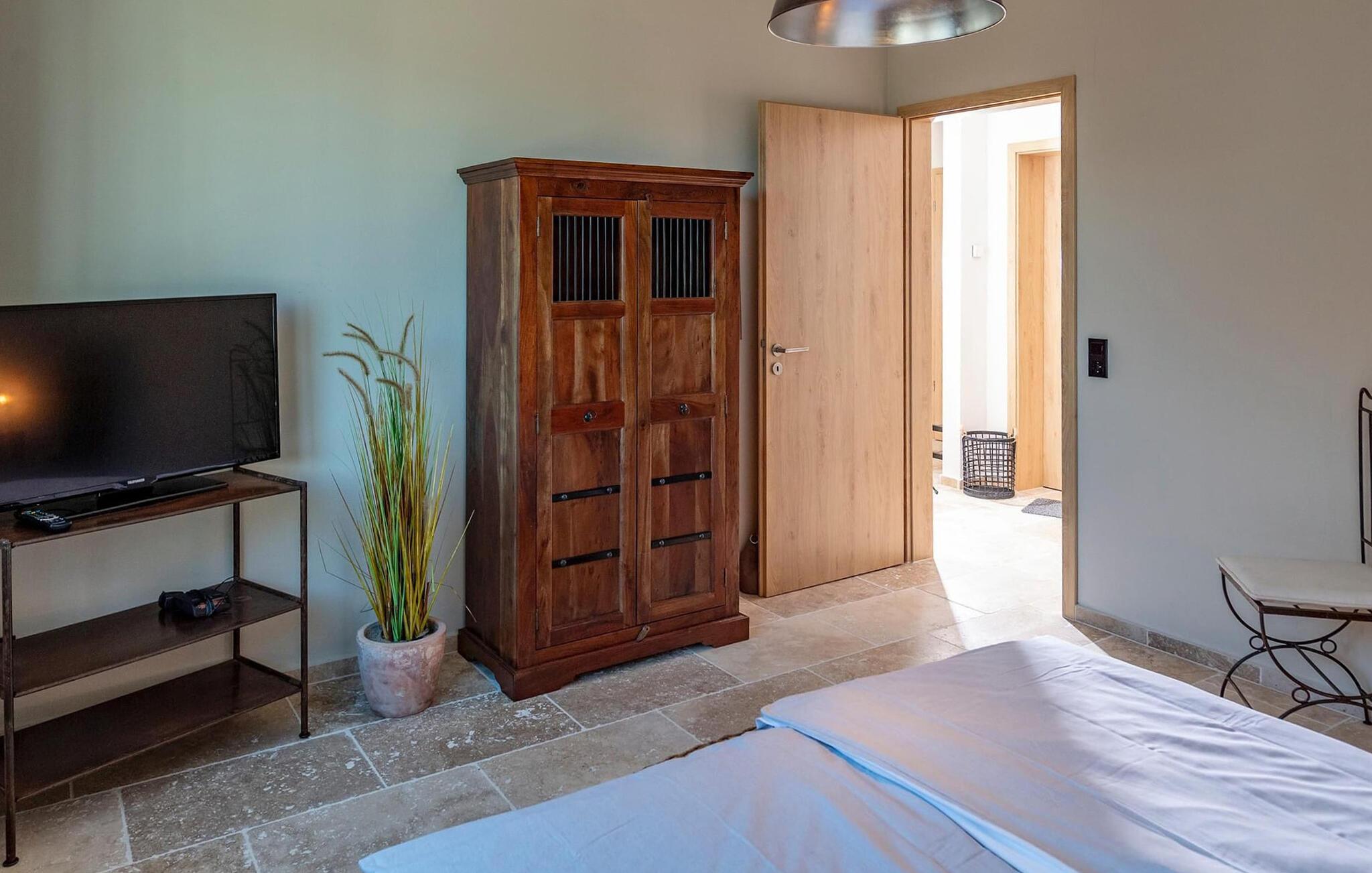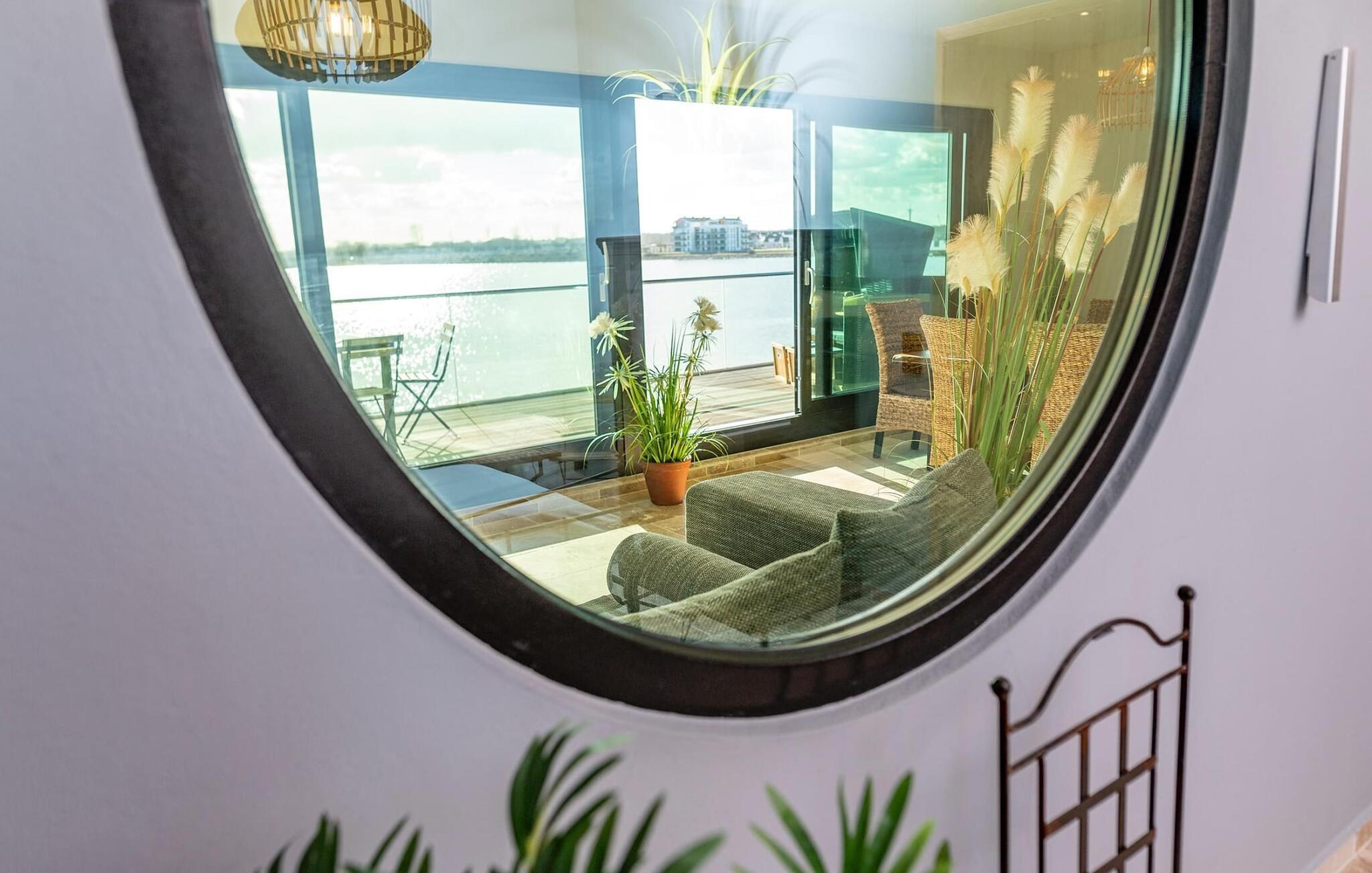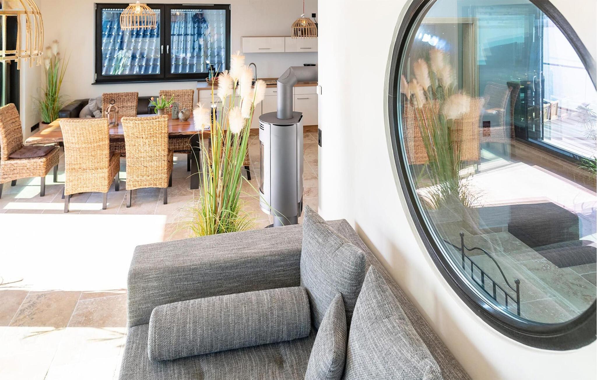 Den unika arkitekturen med imponerande högt i tak och fönster från golv till tak skapar en oförglömlig semesterupplevelse, eftersom vattnet är så nära att man kan röra vid det. Den organiska konstruktionen med kalkputs garanterar ett behagligt inomhusklimat, medan naturstensgolven av ljus italiensk travertin är jordnära i ordets rätta bemärkelse. Detta semesterhus är inrett med hög standard och har en unik design med souvenirer från hela världen. Varje rum har också en annan naturlig väggfärg. De helt speglade fönstren skapar maximal avskildhet.