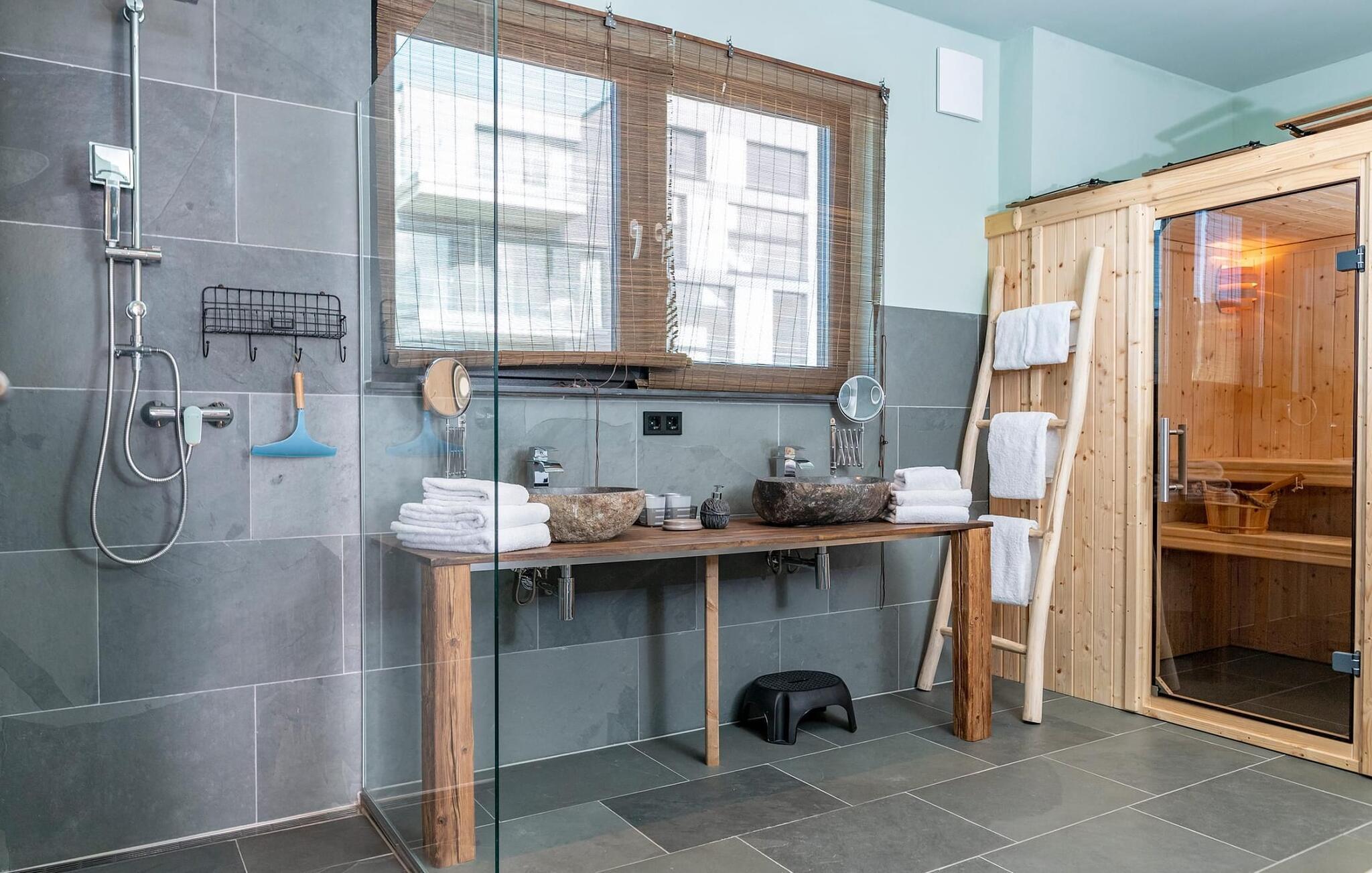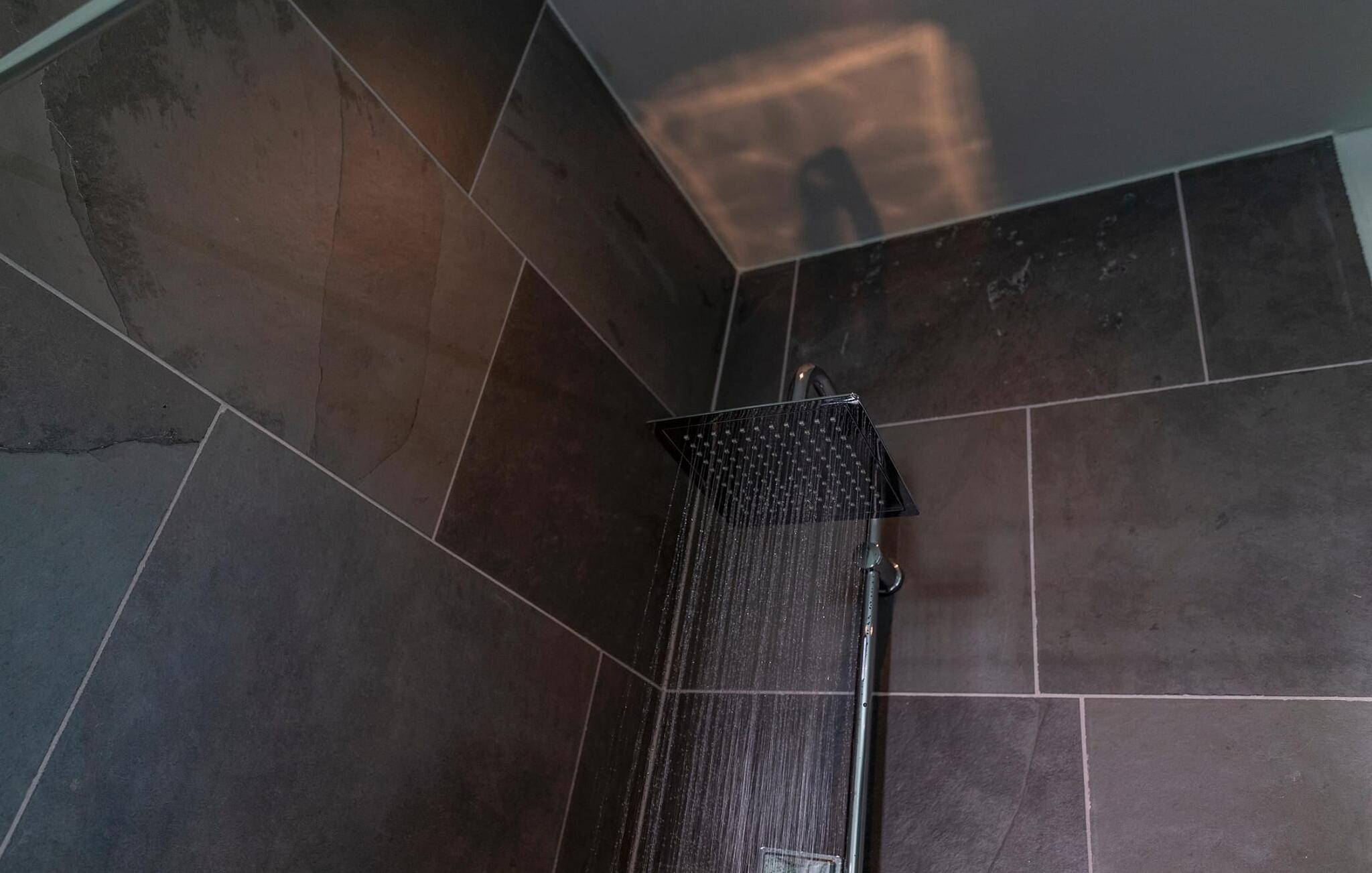 Duschrummet i natursten av brasiliansk skiffer har handgjorda tvättställ av flodsten. En elegant gästtoalett ger ytterligare komfort.