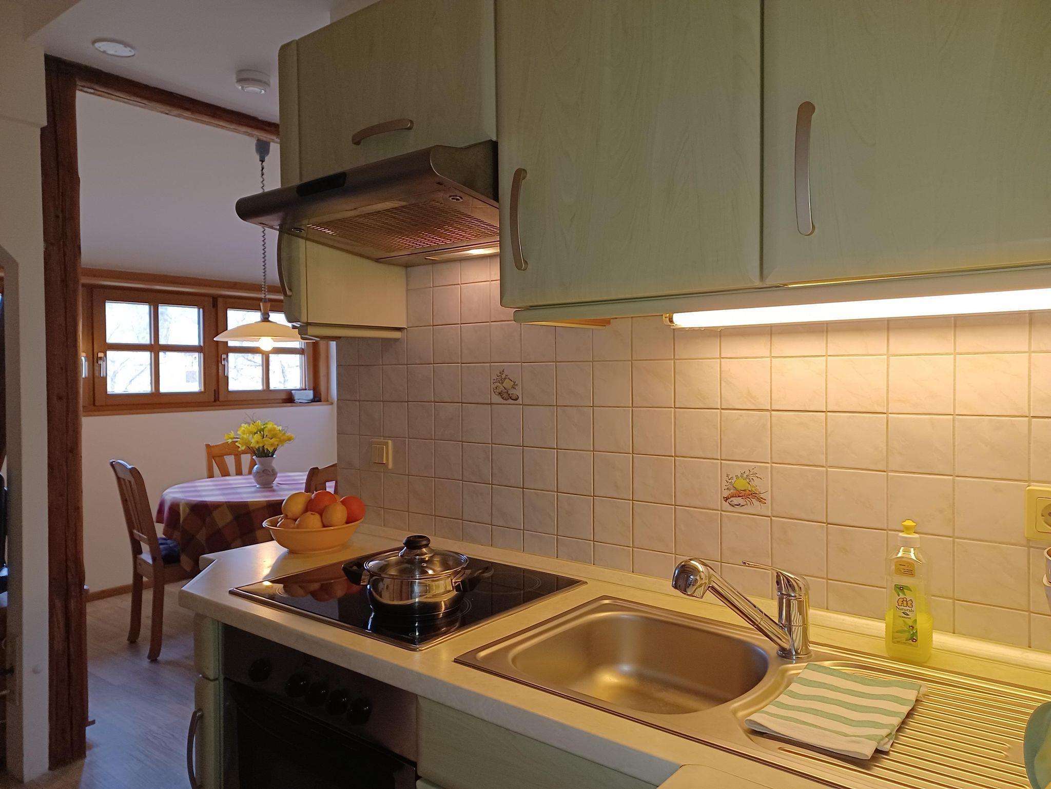 Diese Ferienwohnung ist mit ihren alten Holzbalken, Mansarden und ihrer ganz individuellen Gestaltung etwas für Genießer und Romantiker. Vom Frühstückstisch aus beobachten Sie den Sonnenaufgang über dem Lilienstein, vom Bett aus sehen Sie die angestrahlte Festung Königstein. Die Wohnung verfügt über zwei separate Schlafräume sowie eine urgemütliche Wohnküche mit Essplatz und Fernsehecke. Die Küchenzeile ist mit einem Herd mit 4 Cerankochfeldern u. Backofen, Kühlschrank, Kaffeemaschine, Wasserkocher und Toaster ausgestattet. Das Bad verfügt über Dusche und WC.
