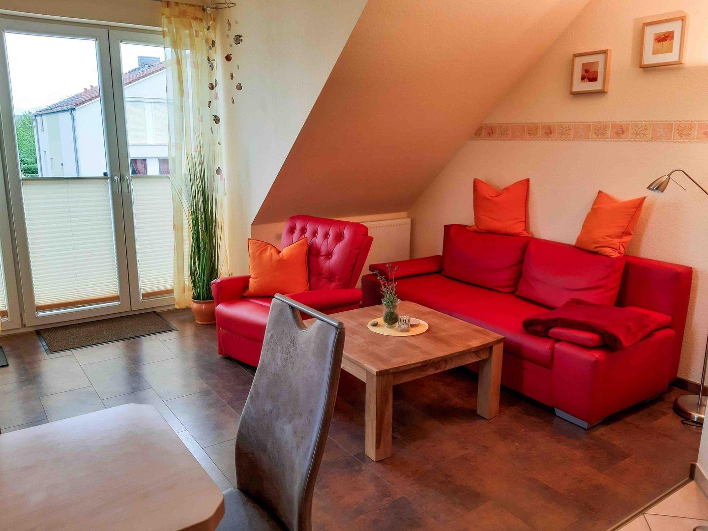 Willkommen in der Ferienwohnung Am Weststrand 6 – Ihrem kleinen Paradies zwischen Meeresrauschen und Dachbalkenromantik. Diese liebevoll gestaltete Wohnung im Dachgeschoss einer charmanten Villa bietet auf 45 m² alles, was man für einen unbeschwerten Urlaub braucht. Der helle Wohnbereich empfängt Sie mit gemütlicher Sitzecke, Schlafsofa und Esstisch – ein Ort, an dem man nach einem Strandtag gern verweilt. Große Fenster lassen das Tageslicht herein und öffnen den Blick ins Grüne, während der Balkon zur stillen Tasse Kaffee oder einem Glas Wein bei Sonnenuntergang einlädt.
