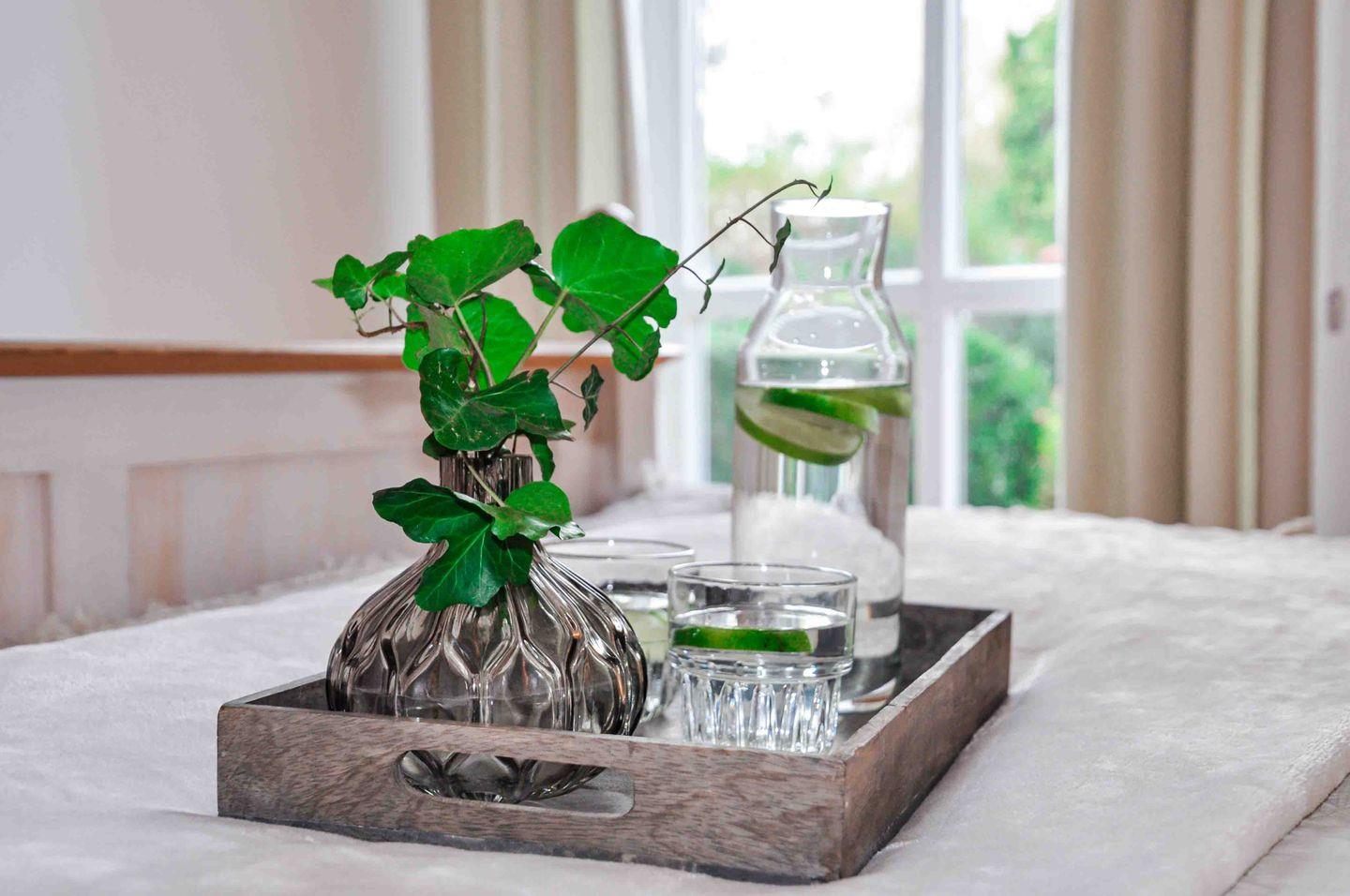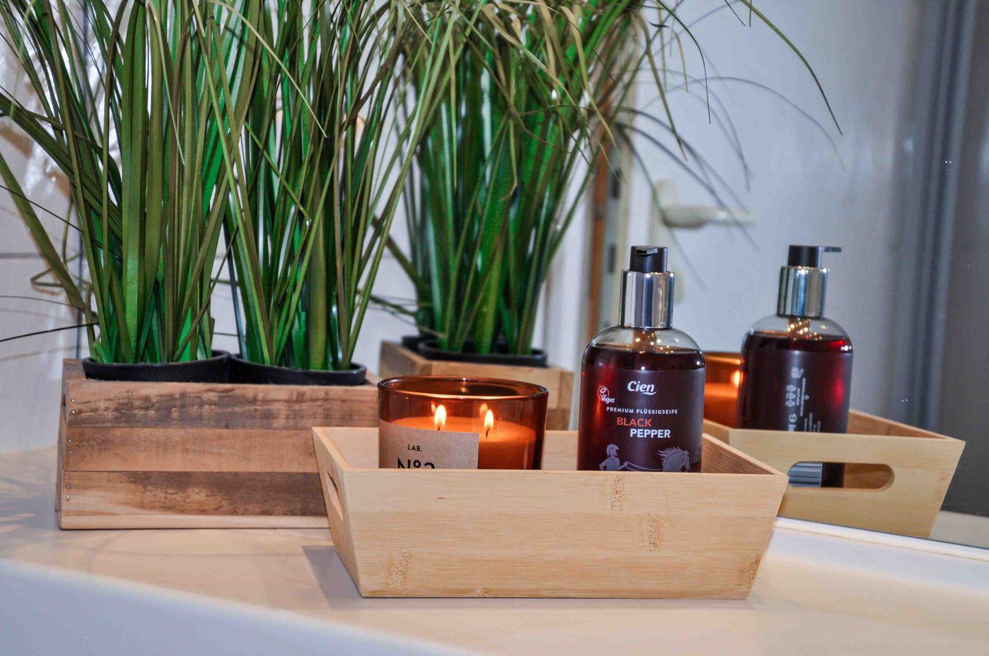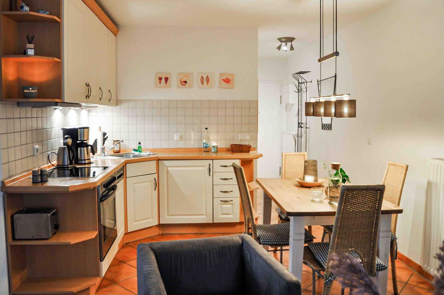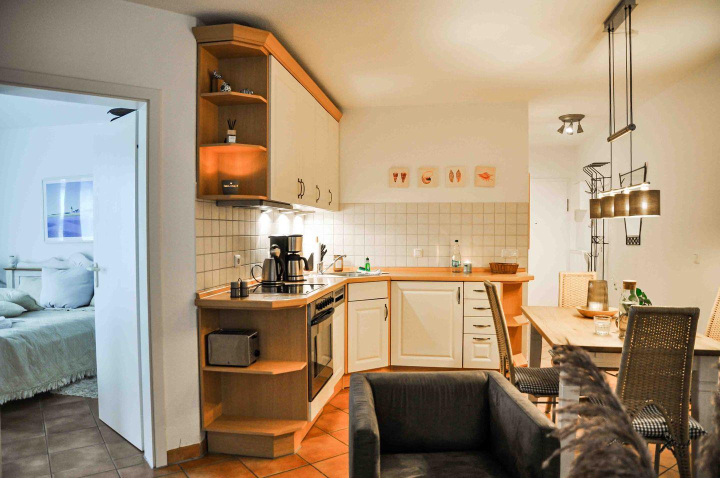 Die Pantryküche ist vollständig ausgestattet und bietet alles für die Selbstverpflegung – vom Cerankochfeld über den Backofen und die Spülmaschine bis hin zu Kaffeemaschine, Wasserkocher und Toaster. Das moderne Badezimmer verfügt über Dusche und WC, Fußbodenerwärmung, Handtuchheizkörper, Kosmetikspiegel und einen Fön.