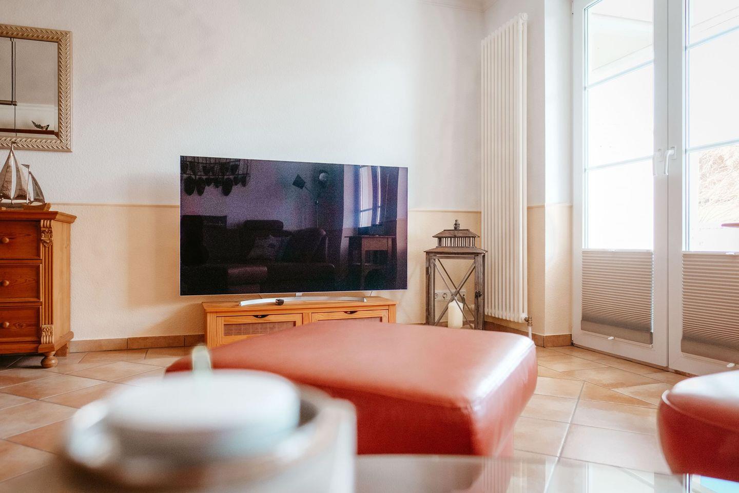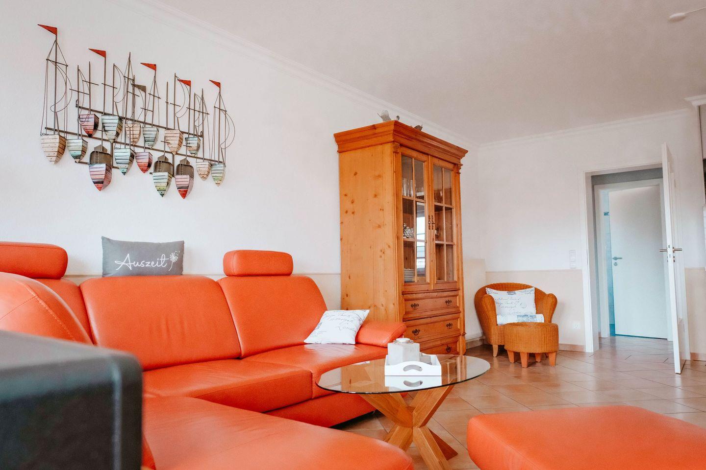 Der gemütliche Wohnbereich lädt mit einer bequemen Couch zum Verweilen ein – perfekt für einen Filmabend oder eine kleine Auszeit. Bei Bedarf verwandelt sich das Sofa in ein Schlafsofa für einen weiteren Erwachsenen oder zwei Kinder. Ein moderner LCD-TV sorgt für Unterhaltung, während die angrenzende Essecke der ideale Ort für gemeinsame Mahlzeiten ist.