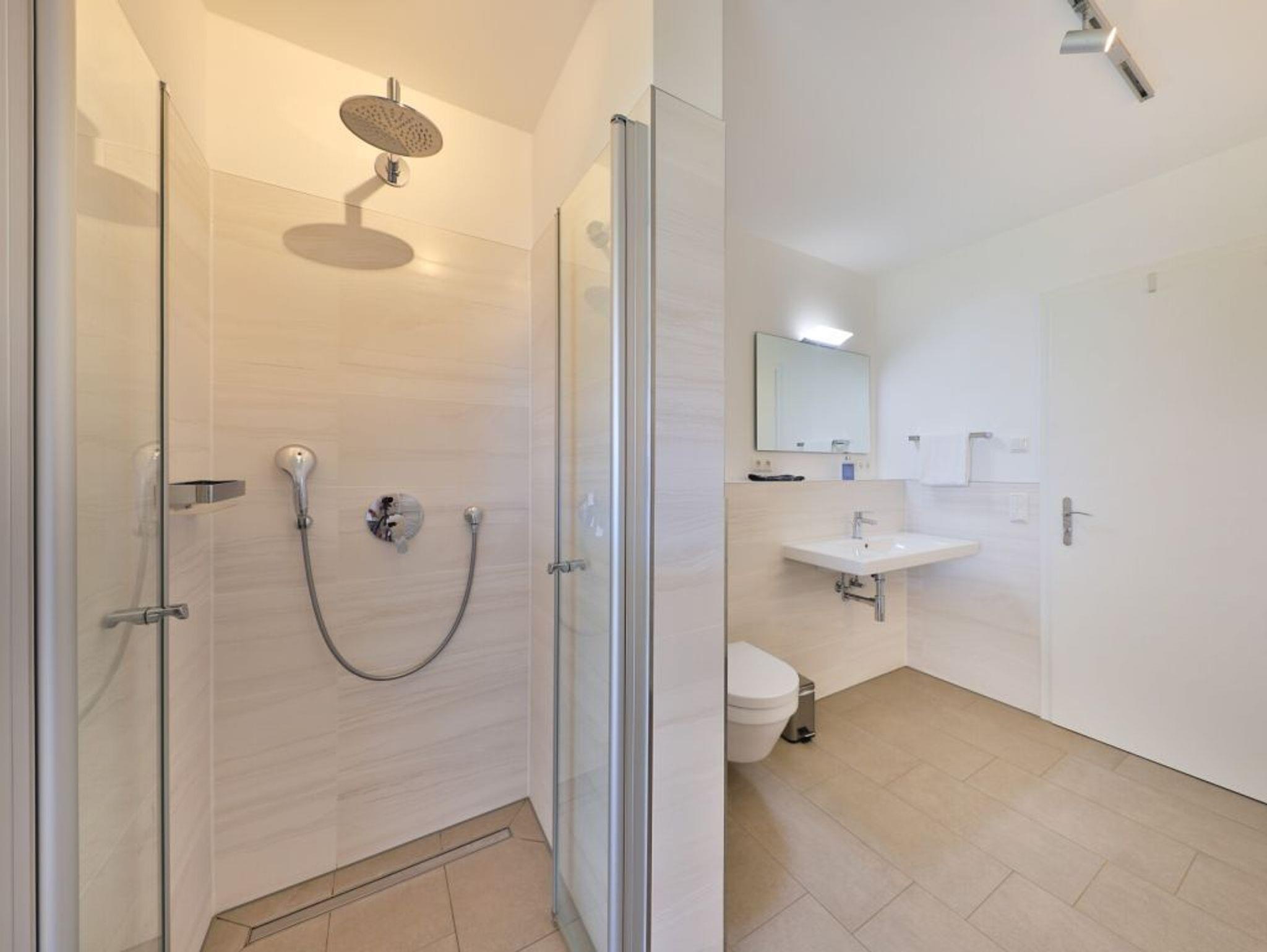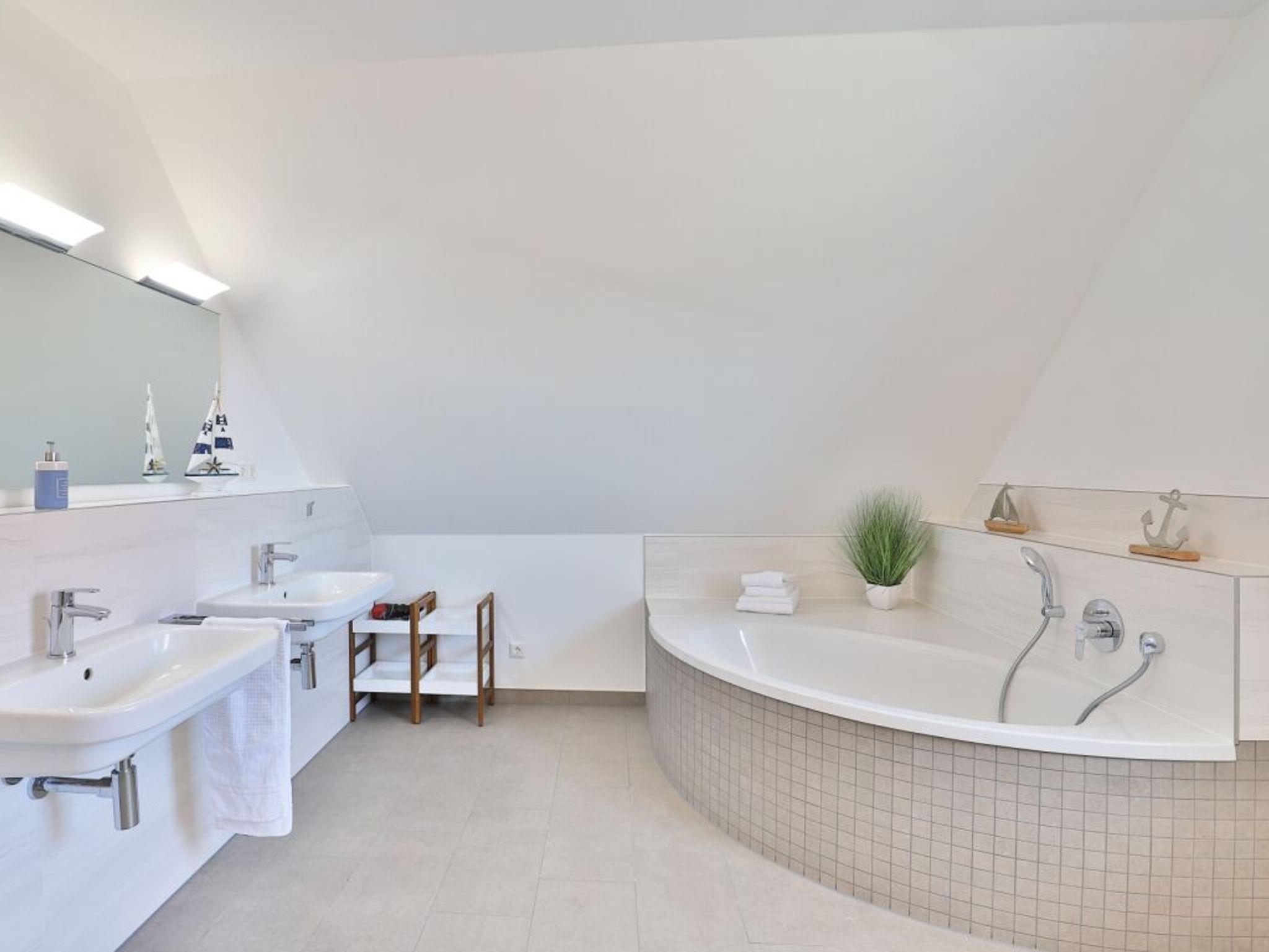 Über eine Treppe im Eingangsflur gelangen Sie in die obere Etage, wo sich zwei weitere Komfort Schlafzimmer befinden. 1x mit Doppelbett, Kleiderschrank, TV sowie Balkonzugang mit Blick über die Felder, 1x mit zwei Einzelbetten, Kleiderschrank und TV. Idealerweise besitzt auch diese Etage ein großzügiges Tageslicht Badezimmer mit Eckbadewanne, bodengleicher Dusche, zwei Waschtische und WC.