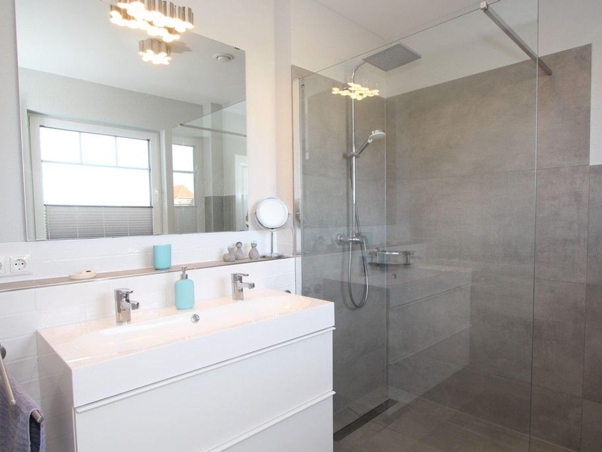 Ferner finden Sie auf dieser Etage das große Vollbad, wieder mit bodengleicher Dusche und Doppelwaschtisch sowie mit integrierter Infrarotwärmekabine.