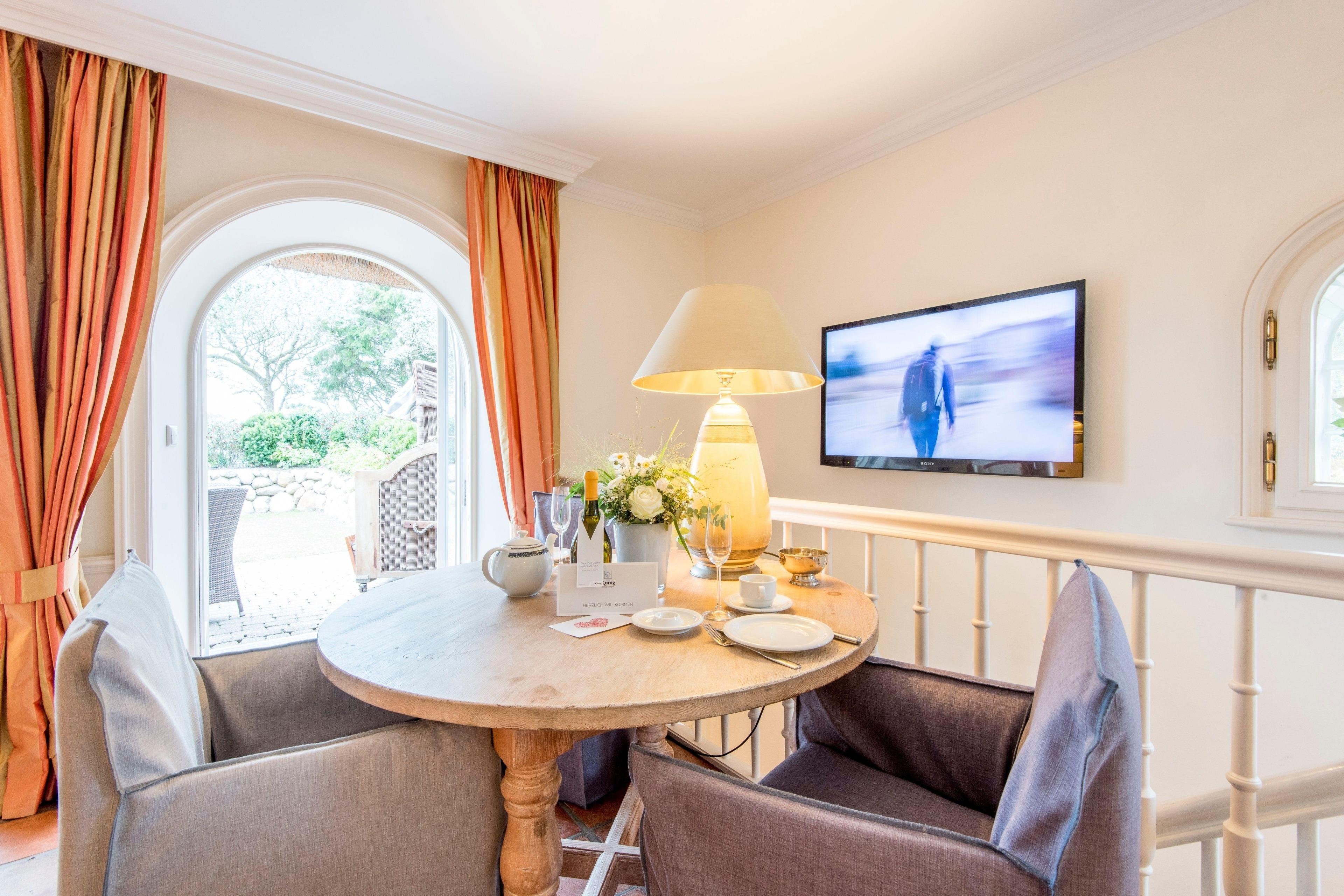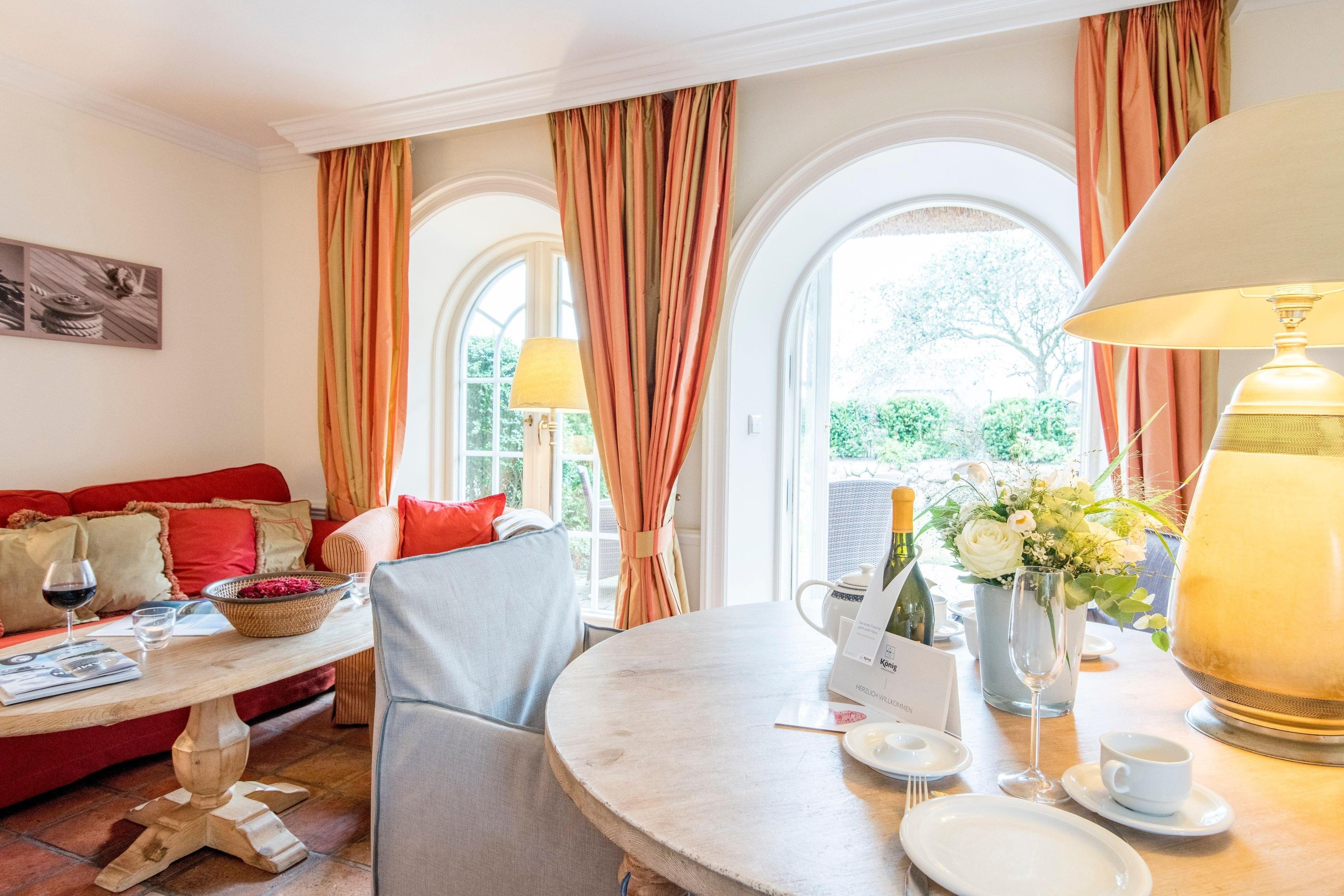 Die Gartensuiten in dem luxuriösen und exklusiv gestalteten Reethaus sind edel und geschmackvoll und hochwertig eingerichtet, sehr ruhig gelegen mit eigenem Garteneingang. Das helle und gemütliche Wohnzimmer mit offenem Kamin mit schönem essplatz für 3-4 pers hat einen edlen antikem Plavoisen-Fliesenboden mit Fußbodenheizung, großen Flatscreen-TV, gemütlicher Essplatz mit großem Tisch und kleiner voll ausgestatteter Pantry-Küche mit Geschirrspüler, Ceranfeld mit 2 Pl und Nespresso-Maschine (inkl Startset mit 10 Kapseln). Der eigene sonnige Garten und Garteneingang mit Friesenwällen, Strandkorb und schönen Gartenmöbeln ist schön eingewachsen und ruhig gelegen.