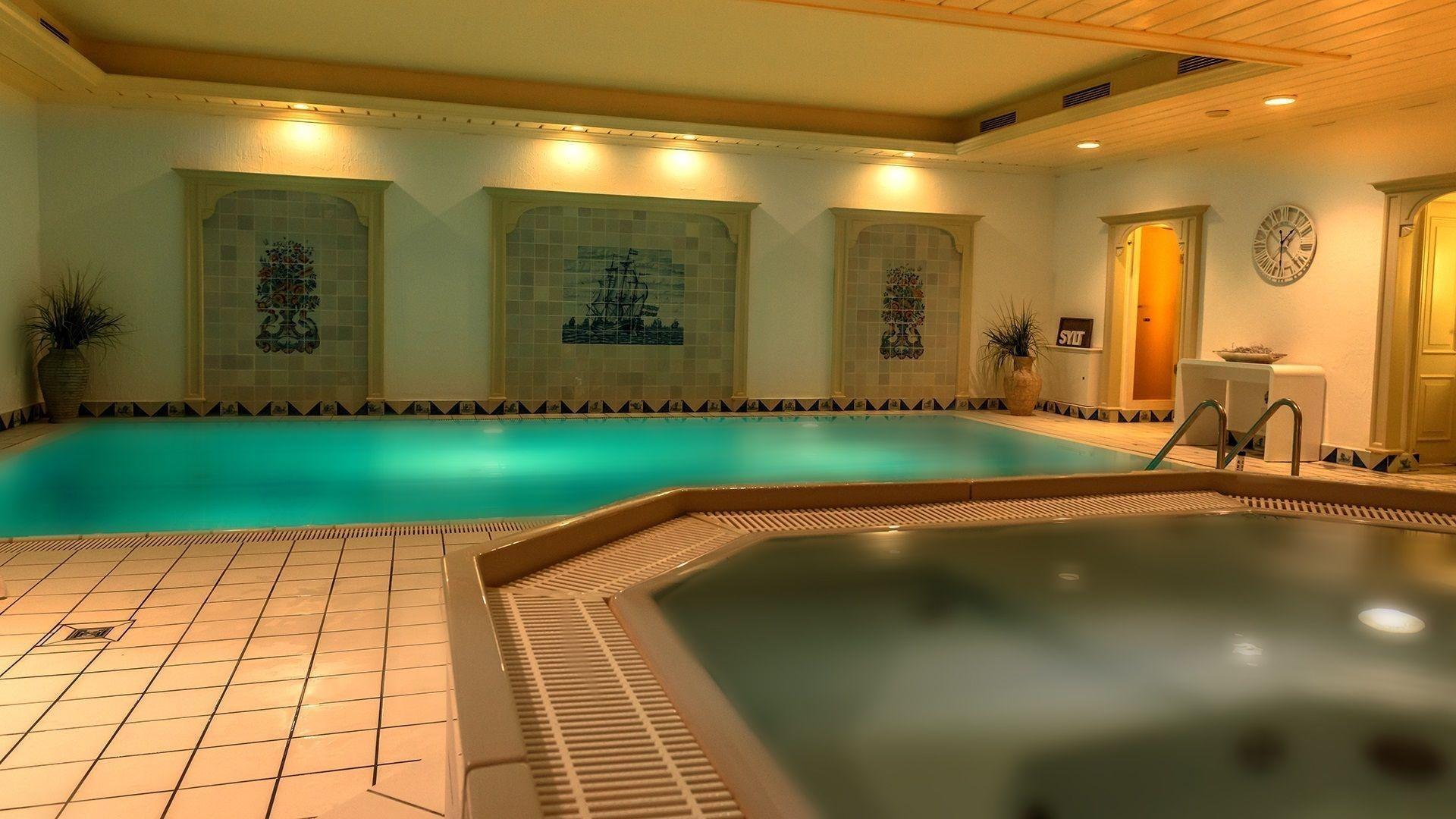 Exklusiver Wellnessbereich im Haus mit großzügigem Schwimmbad (3 Bahnen), Sauna und Relax-Liegen. Kostenfreie Nutzung von W-Lan im Hause.