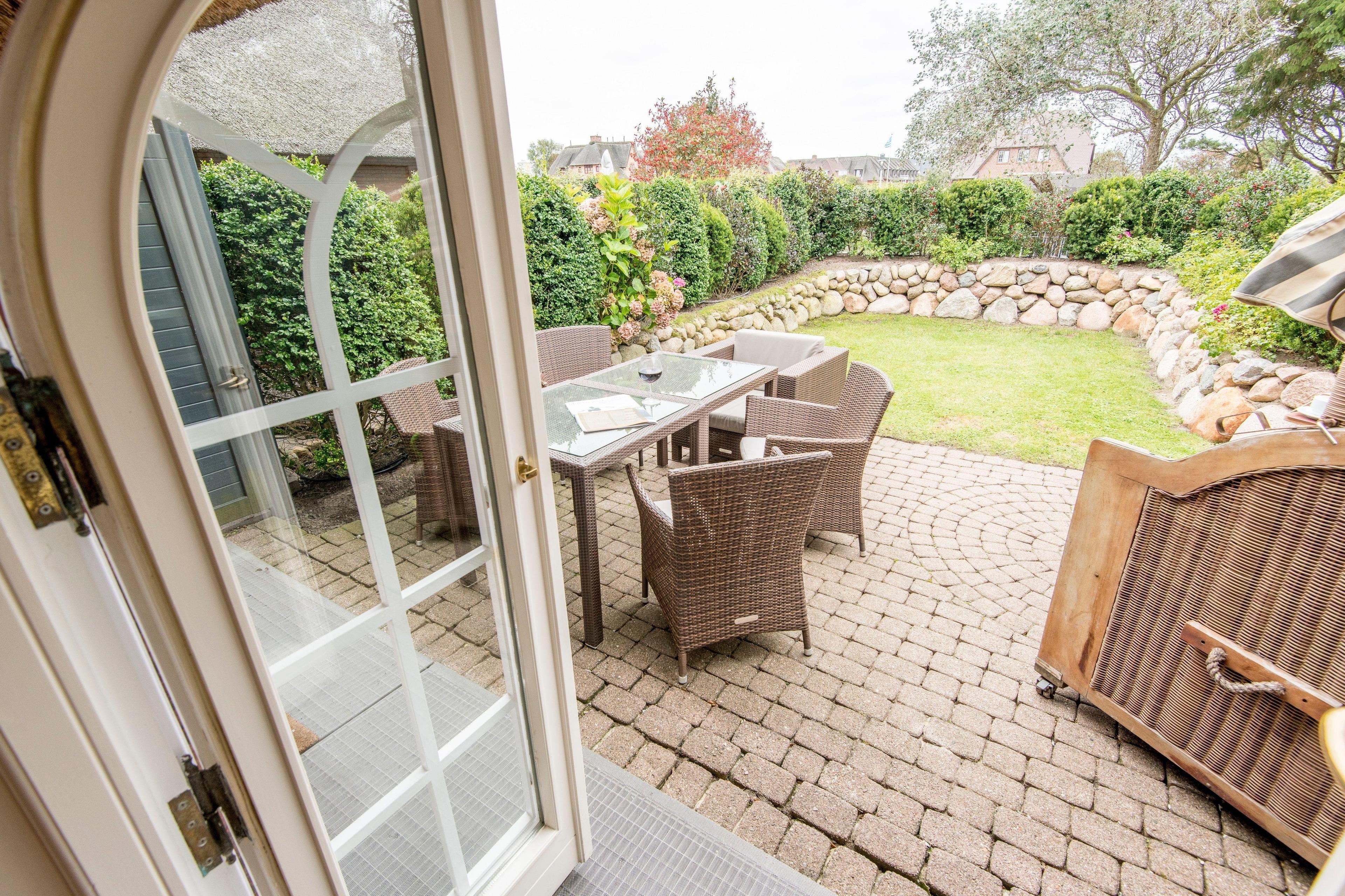 Die Gartensuite West hat einen kleinen privaten und ruhigen Garten mit edlem Strandkorb und schönen Gartenmöbeln, außerhalb der Saison mit Blick bis zur Kampener Heide.